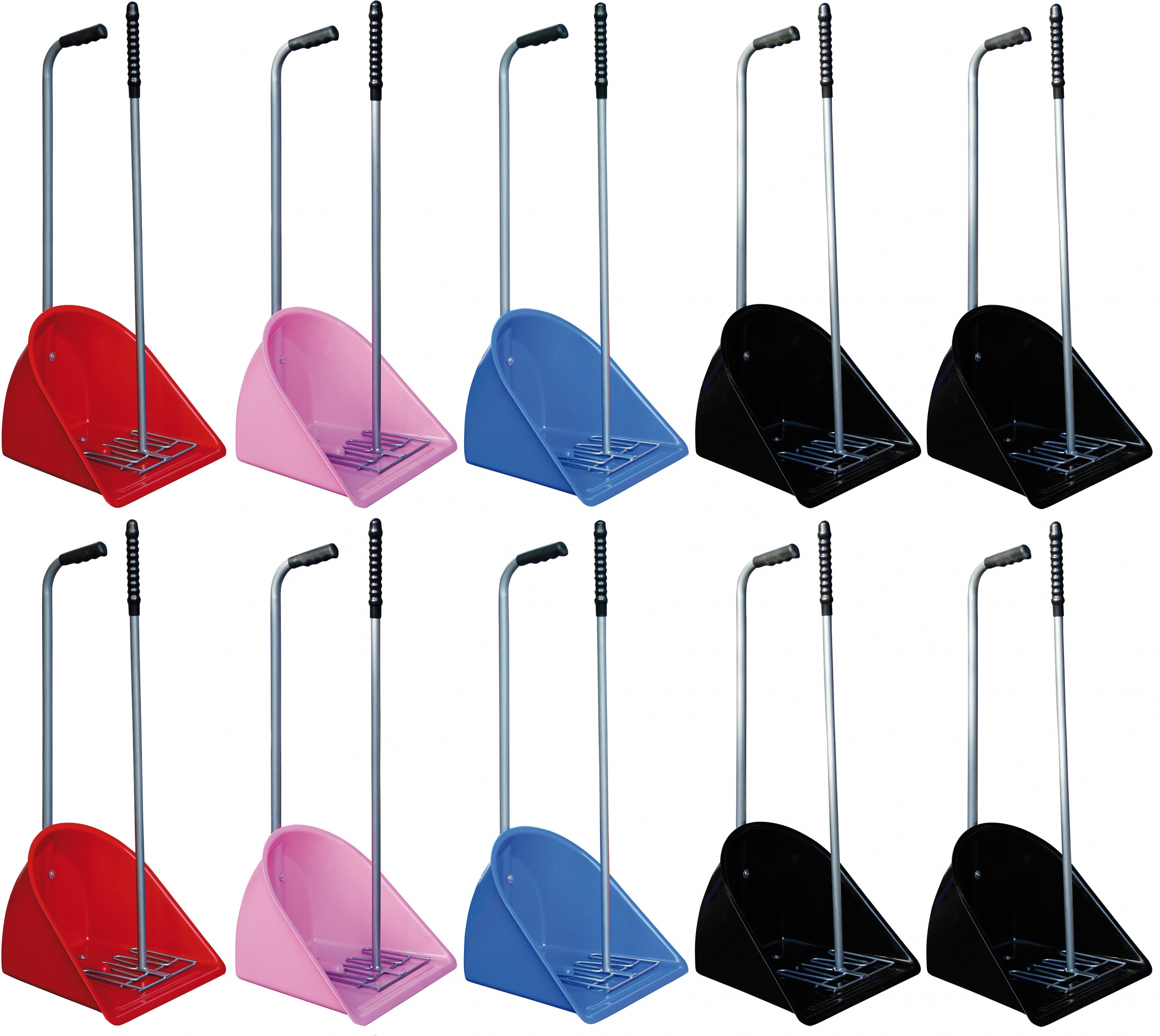 Ideaal voor in de stal, trailer en in de stalgangen. Stabiele verzamelbak van kunststof en handige mestvork van metaal. Complete set bestaand uit bak en hark. Afmeting: 80cm Assorti-verpakking: 2*rood 2*roze 2*blauw 4*zwart