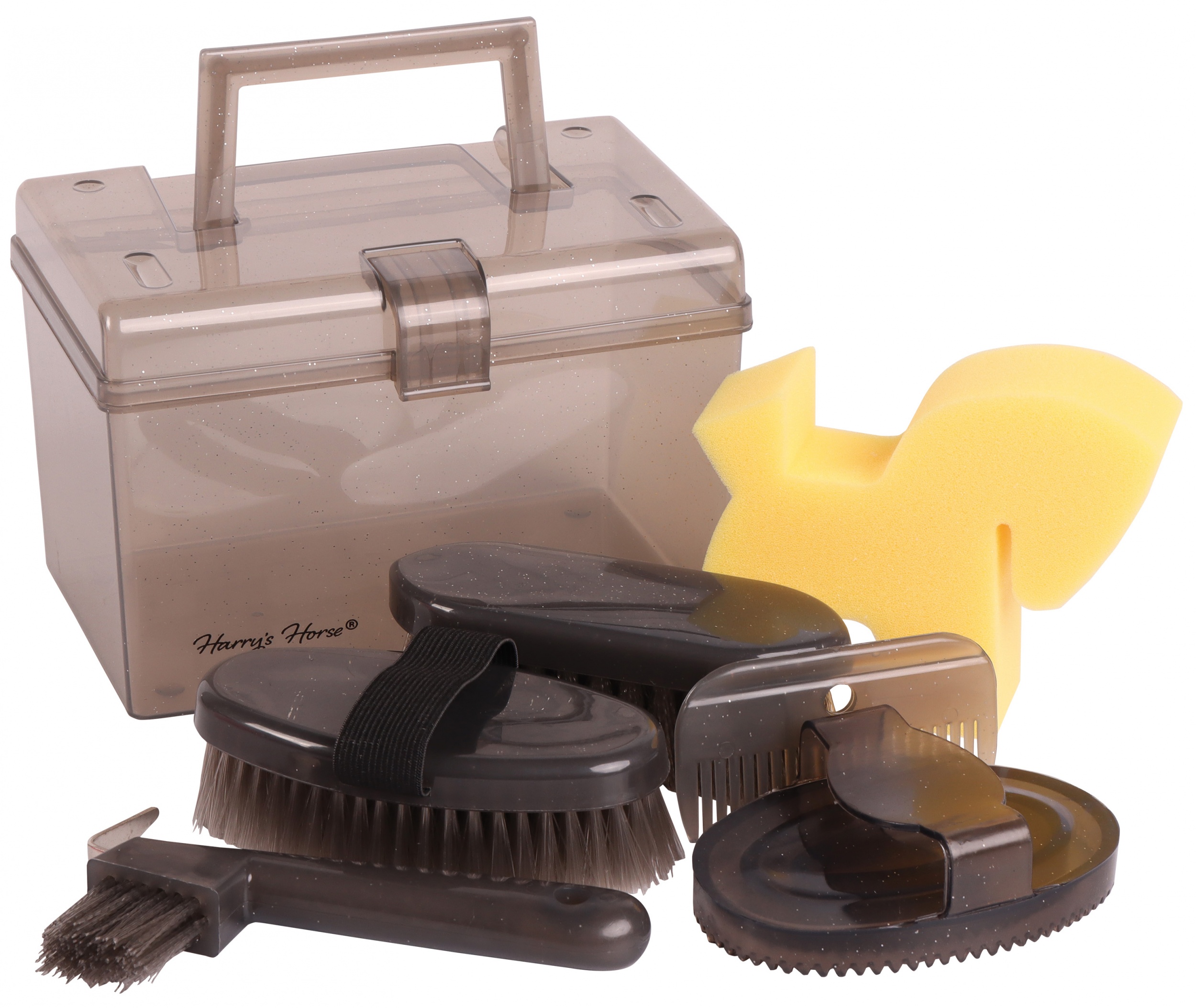 Mini poetsbox met een harde borstel, zachte borstel, rubber rosborstel, manenkam, hoevenkrabber en een spons. Afmeting box: 20x13,5x14cm