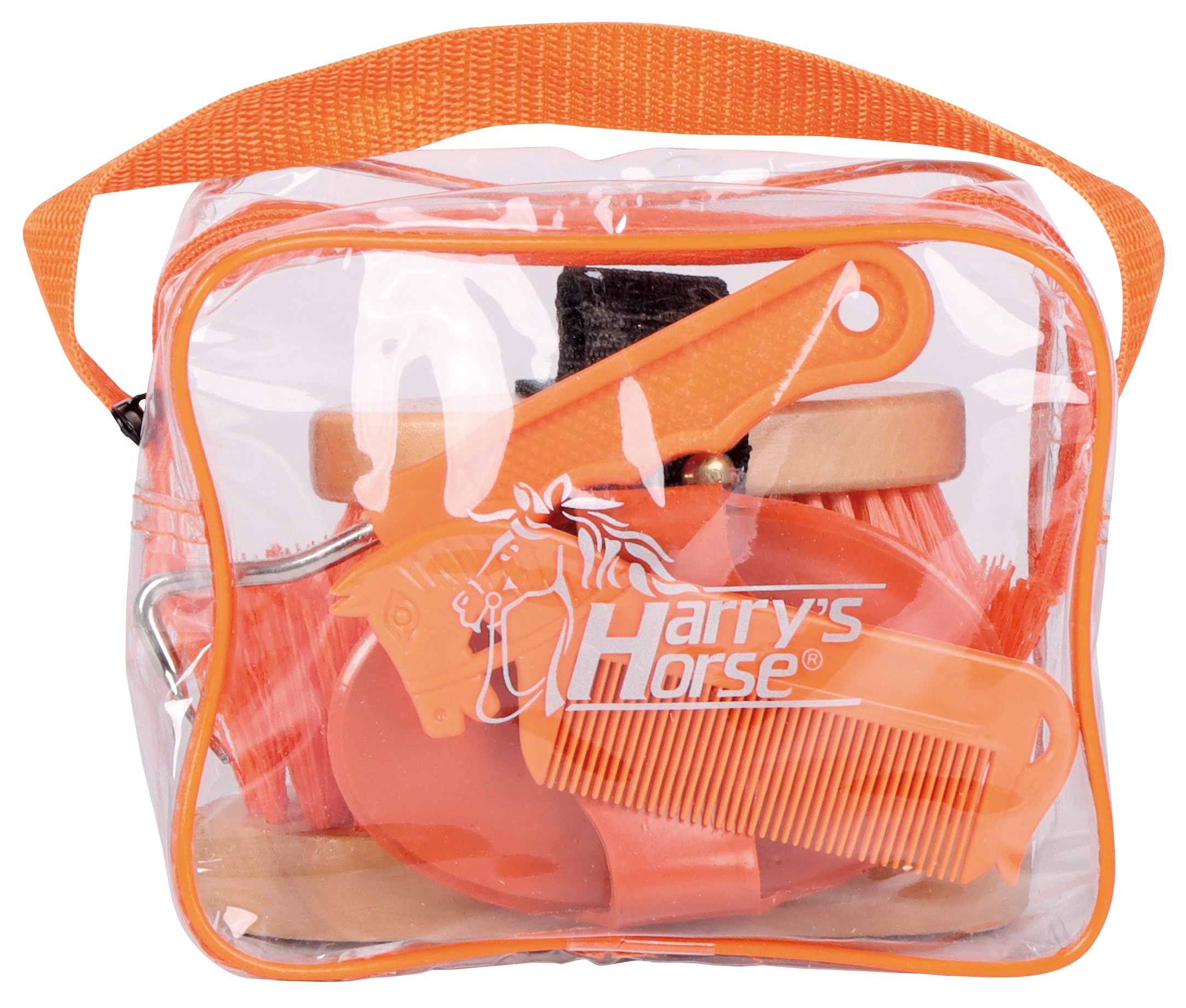 Opties Poetssetje voor de allerkleinsten. vier-delige set bestaande uit een ros borstel, harde borstel, glansborstel, manenkam en hoevenkrabber in handig tasje. Afmetingen: 17x14x9 cm