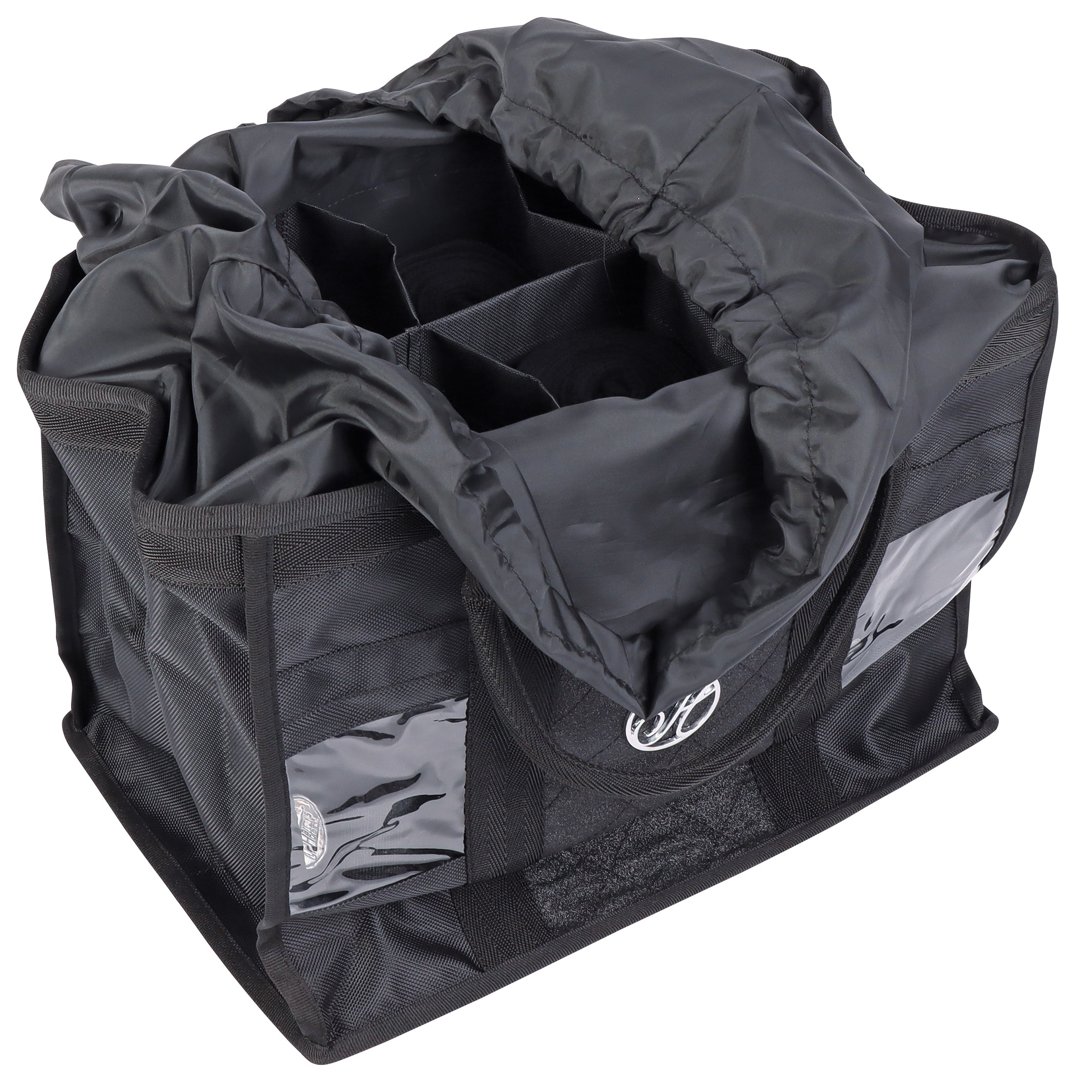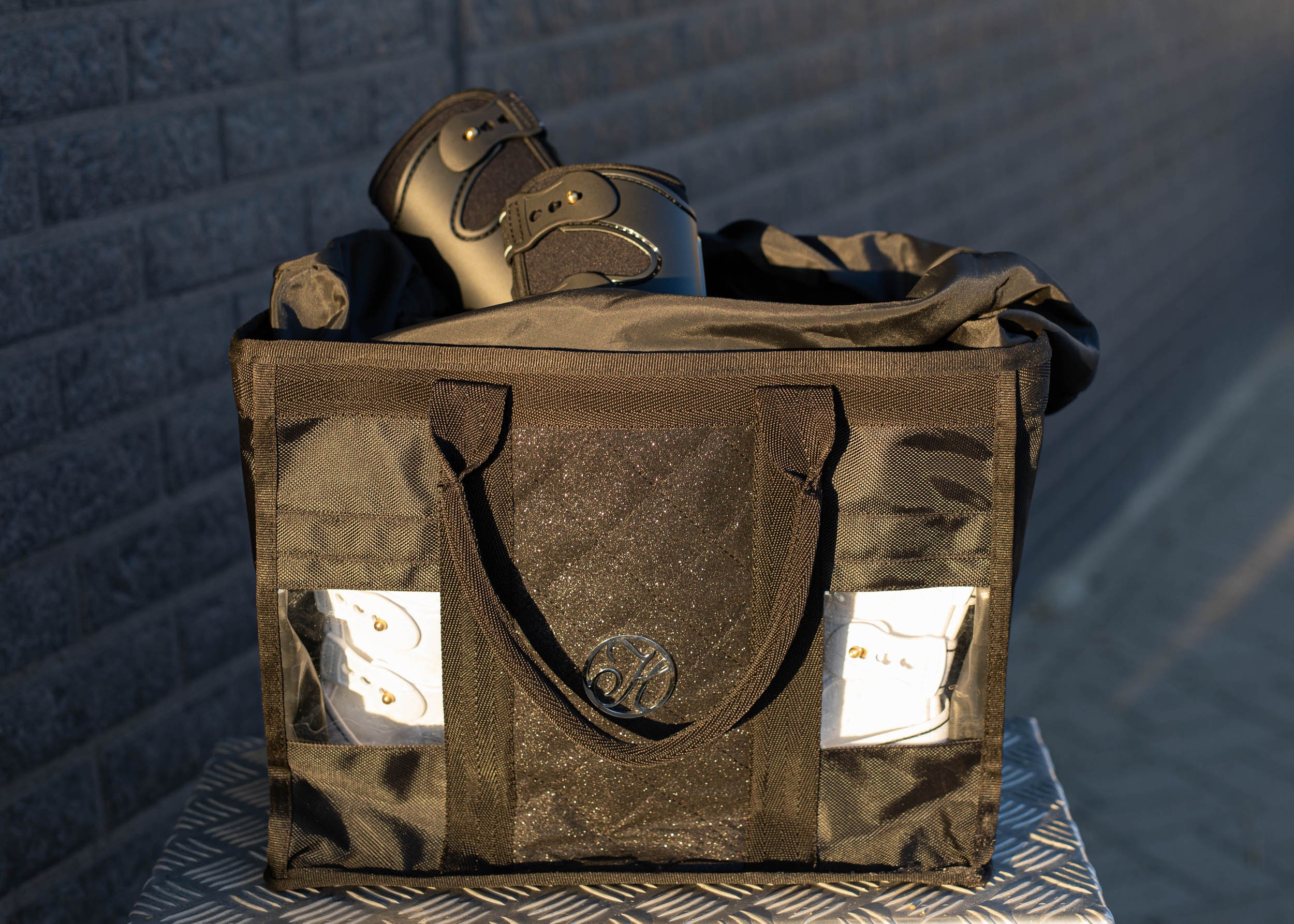 Multifunctionele en luxe tas gemaakt van sterke stof voorzien van glitters. Voorzien van 6 aparte compartimenten voor bijvoorbeeld beenbeschermers,verzorginsartikelen en nog veel meer. De bovenkant is afsluitbaar met een trekkoord. Afmeting: 41x20x30cm.
