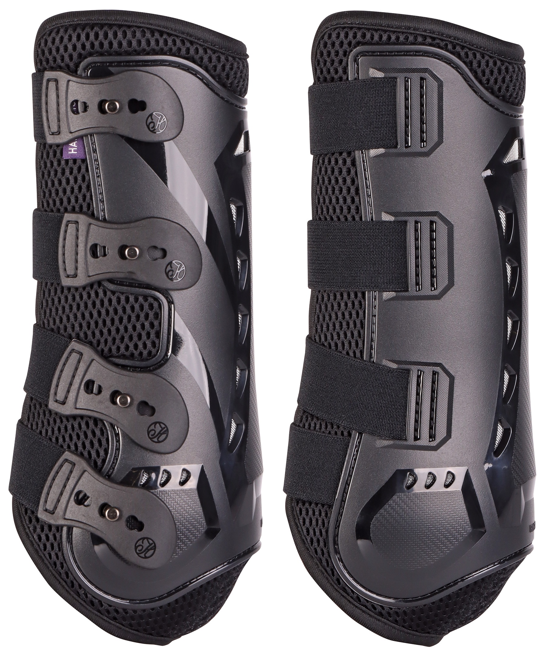 Peesbeschermers met een perfecte pasvorm rond het been en de kogel voor optimale bescherming. Voorzien van sterke, elastische sluitingen. Dankzij de speciale knopsluiting is klittenband overbodig. De ventilatiegaten met "metal mesh" in de schaal zorgen voor effectieve luchtcirculatie. Door de ergonomische pasvorm behoudt het paard maximale bewegingsvrijheid. De buitenschaal van TPU beschermt tegen aantikken en is voorzien van extra versteviging bij de pees en kogel voor verhoogde bescherming. Lengte TPU-schaal achterzijde maat L: 21 cm. Deze peesbeschermer is speciaal ontworpen voor de voorbenen (voor achterbenen, zie artikelnummer 33200017).