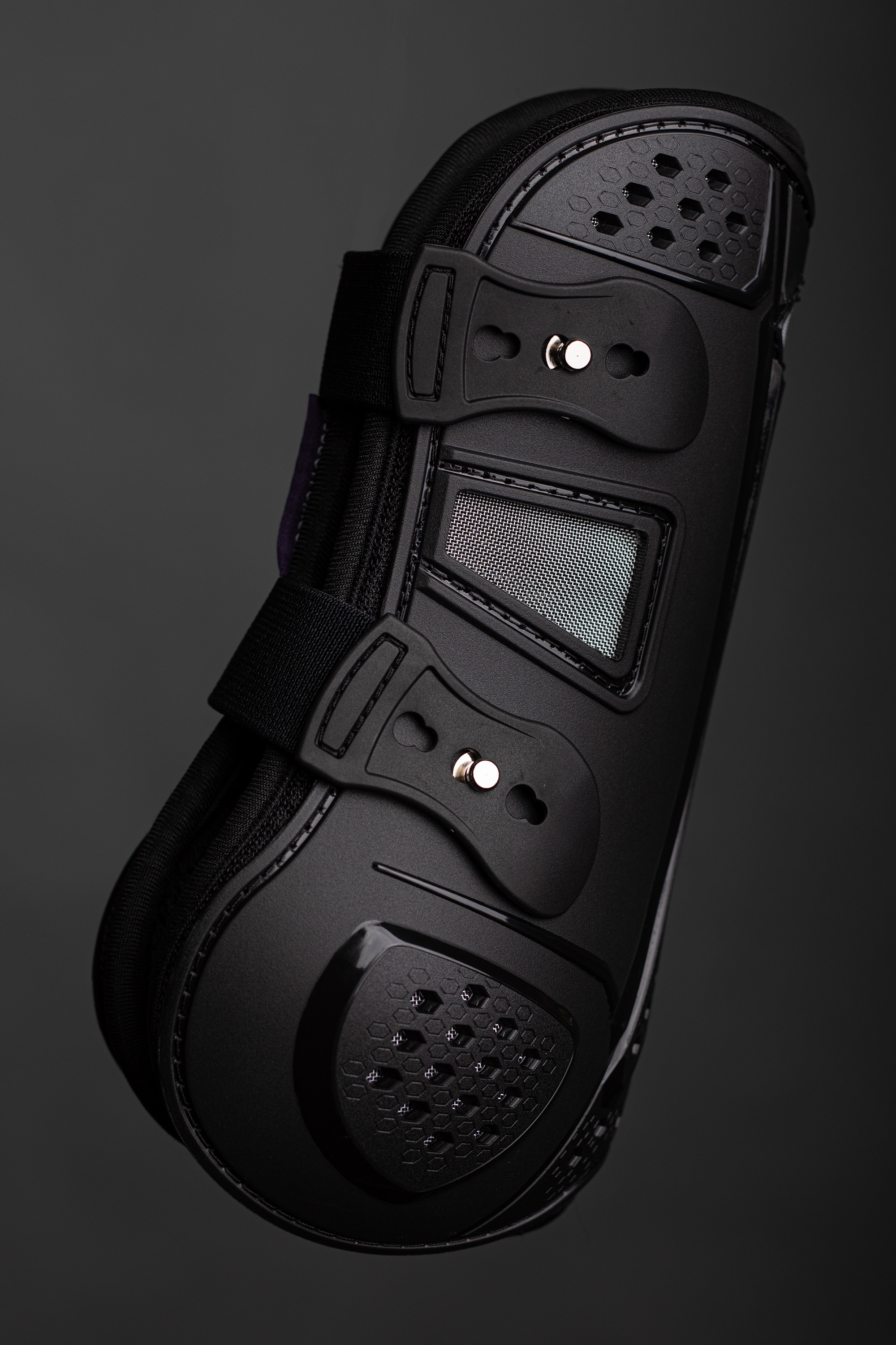 Het soepele, lichte TPU-materiaal van de peesbeschermers zorgt voor een perfecte bewegingsvrijheid van het paard en beschermt bij aantikken. De voering is gemaakt van 6mm geperforeerd TPG-materiaal. TPG is lichtgewicht en schokabsorberend en is een hoogwaardige vervanger voor het traditionele neopreen. De ventilatieopeningen in de buitenschaal en de perforatie van de voering beperken de opwarming van het paardenbeen maximaal tijdens en vooral na de inspanning. De anatomische vorm sluit perfect aan bij de pezen om ze zijdelings te ondersteunen tijdens de oefening. Lengte schaal maat full: 21cm Past bij: Strijklappen Breathe (33200023).
