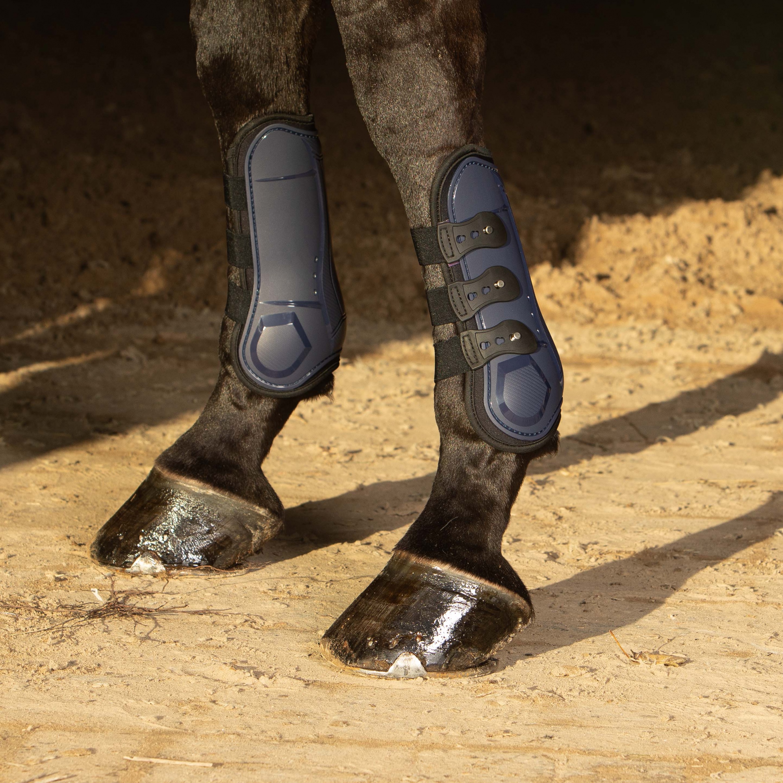 Prachtige peesbeschermers met een perfecte pasvorm. Met sterke, elastische sluitingen. Door de speciale knopsluiting is er geen klittenband nodig. De "metal mesh" ventilatiegaten in de schaal zorgen voor ventilatie en beluchting. Door de optimale pasvorm heeft het paard veel bewegingsvrijheid. De TPU buitenschaal beschermt tegen aantikken en heeft een extra verdikking op de pees en op de kogel voor extra bescherming. Lengte schaal achterzijde: Pony: 18cm Cob: 20cm Full: 21cm. Pony en Cob hebben twee sluitingen en Full drie sluitingen Deze beenbeschermer is speciaal ontworpen voor de voorbenen (achterbenen zie artikelnummer 33200014).