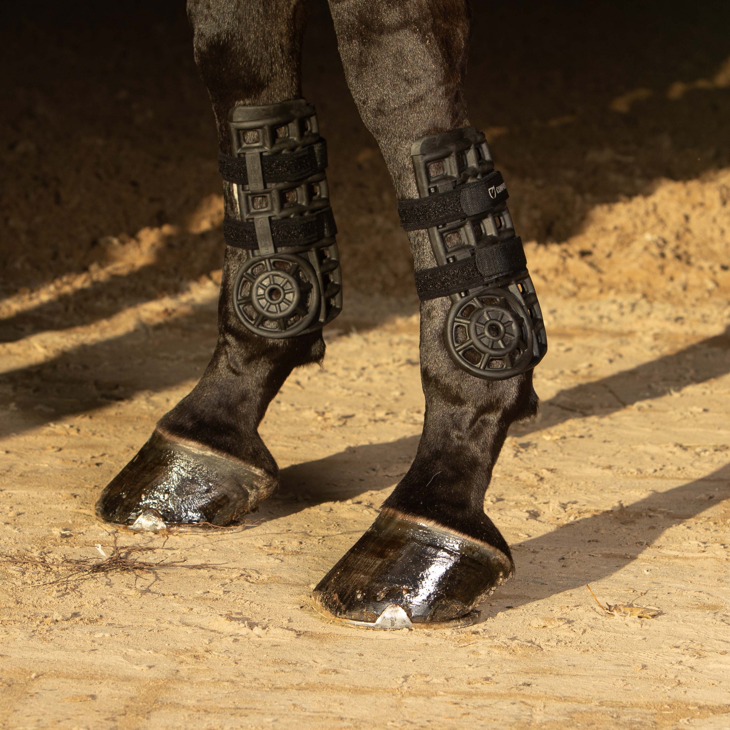 Opties Het soepele, lichte en niet-absorberende materiaal van de peesbeschermers PROTECH zorgt voor een perfecte bewegingsvrijheid van het paard en vermindert het risico op wrijvingswonden. De open zones beperken de opwarming van het paardenbeen maximaal tijdens en vooral na de inspanning. De anatomische vorm van Protech sluit perfect aan bij de pezen om ze zijdelings te ondersteunen tijdens de oefening. Lengte maat full: 23cm