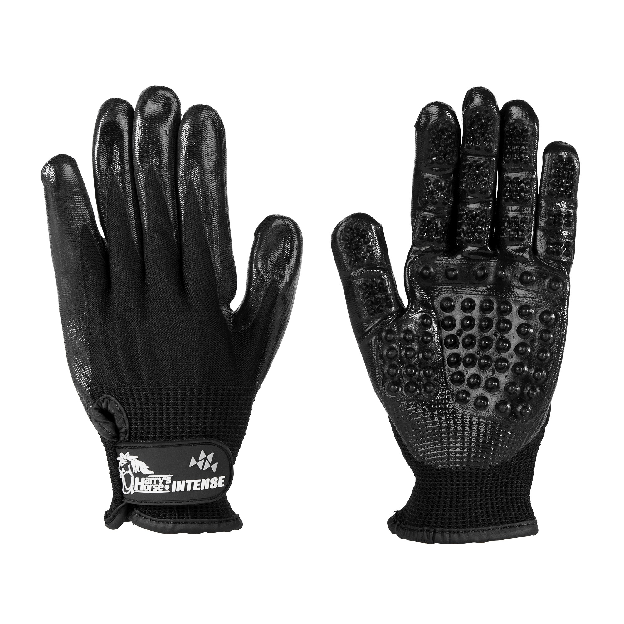 Handschoen met op de palm en vingers stevige massage/ scrub nopjes in verschillende formaten. Ideaal: - bij het poetsen/ verzorgen van het paard - bij het wassen van het paard (ook bij vlekken) - bij het verharen. Losse haren schud je er zo weer vanaf - om de bloedsomloop te stimuleren (massage) - bij gebruik op gevoelige plaatsen zoals hoofd en benen - bij gebruik op andere dieren zoals hond of kat. Een maat. Ruime pasvorm door elastische bovenzijde. Worden verkocht per paar.