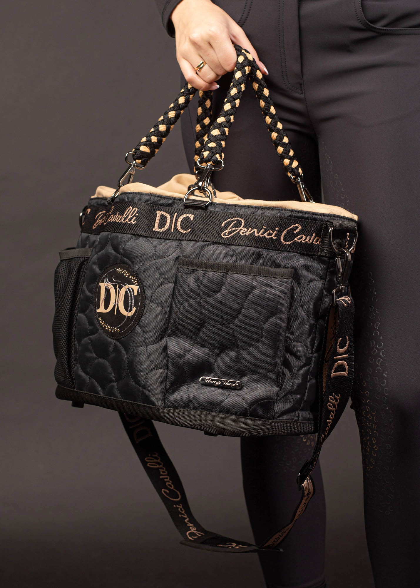 Poetstas met allover quilt, Denici Cavalli logo met kristallen, webbing rondom met het Denici Cavalli logo, een contrasterende bovenzijde afsluitbaar met een tweekleurig trekkoord, twee opbergvakken aan de buitenkant, verstelbare schouderband met het Denici Cavalli logo en kunststof noppen aan de onderkant. Afmeting 35 x 20 x 28 cm Materiaal: 100% polyester.