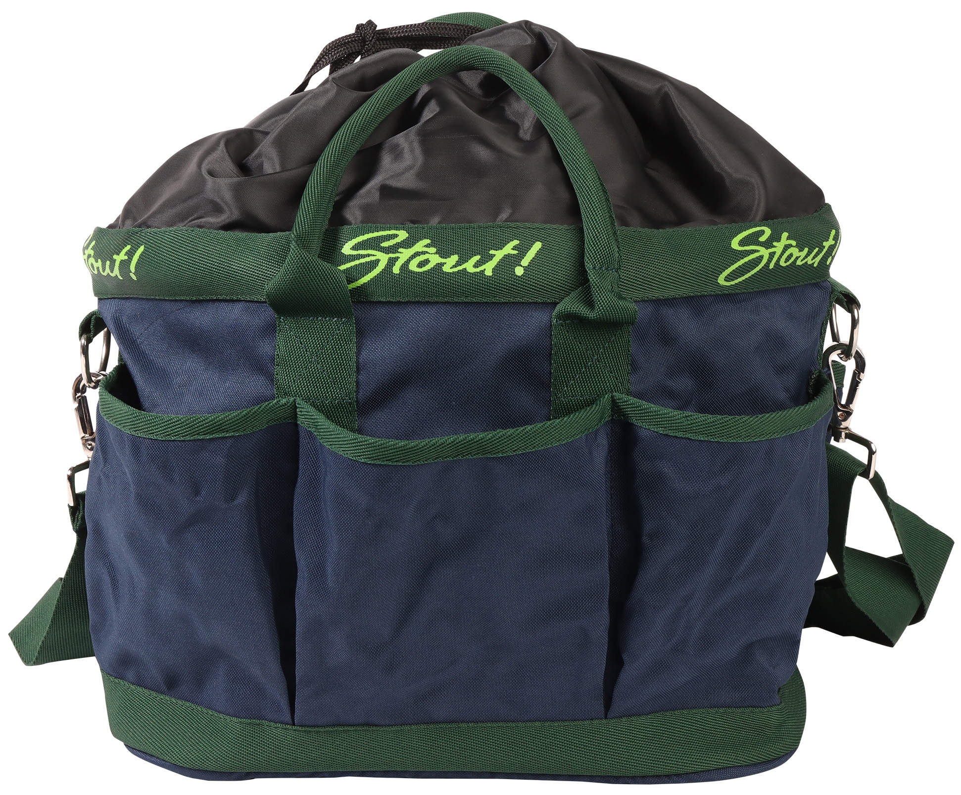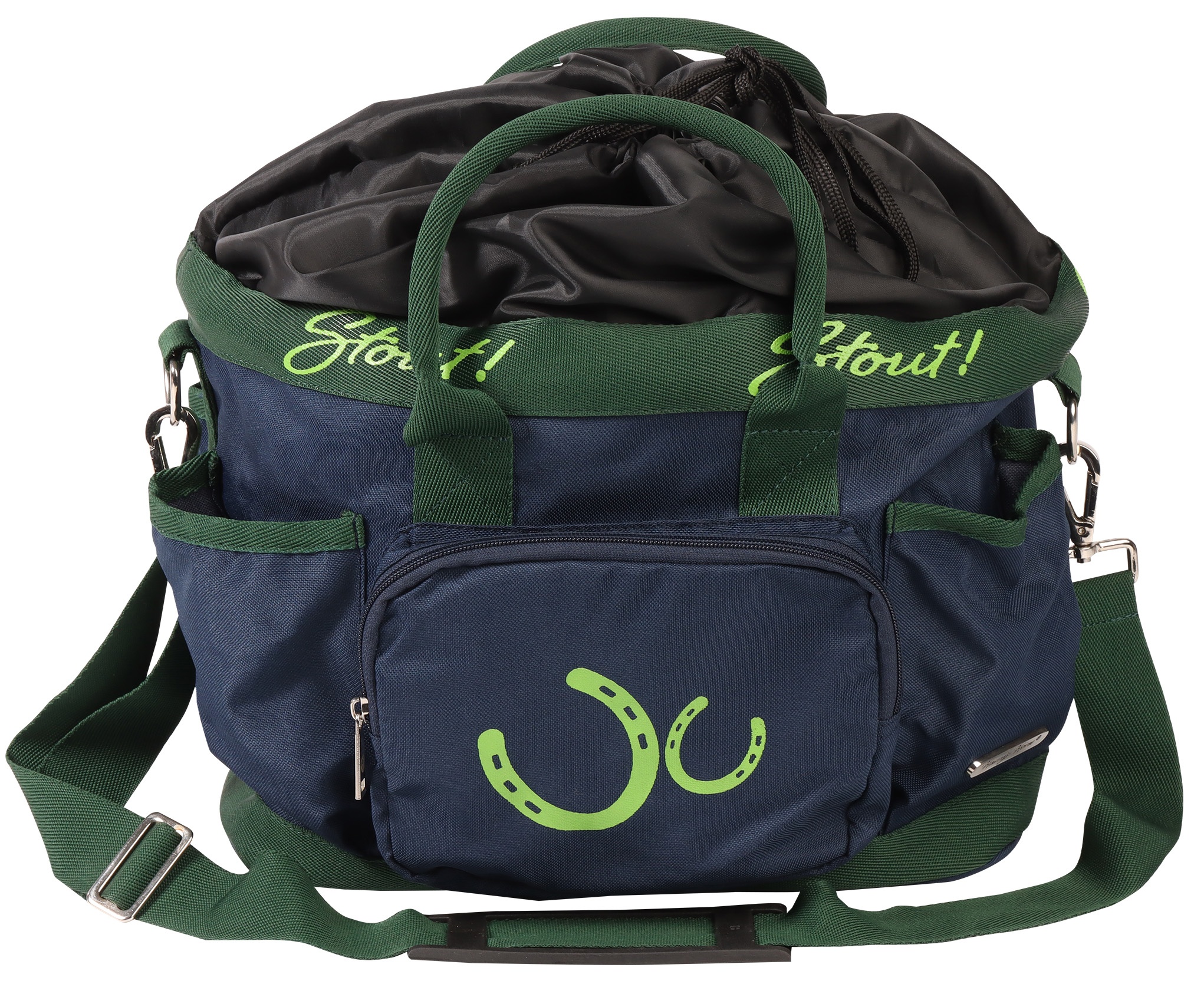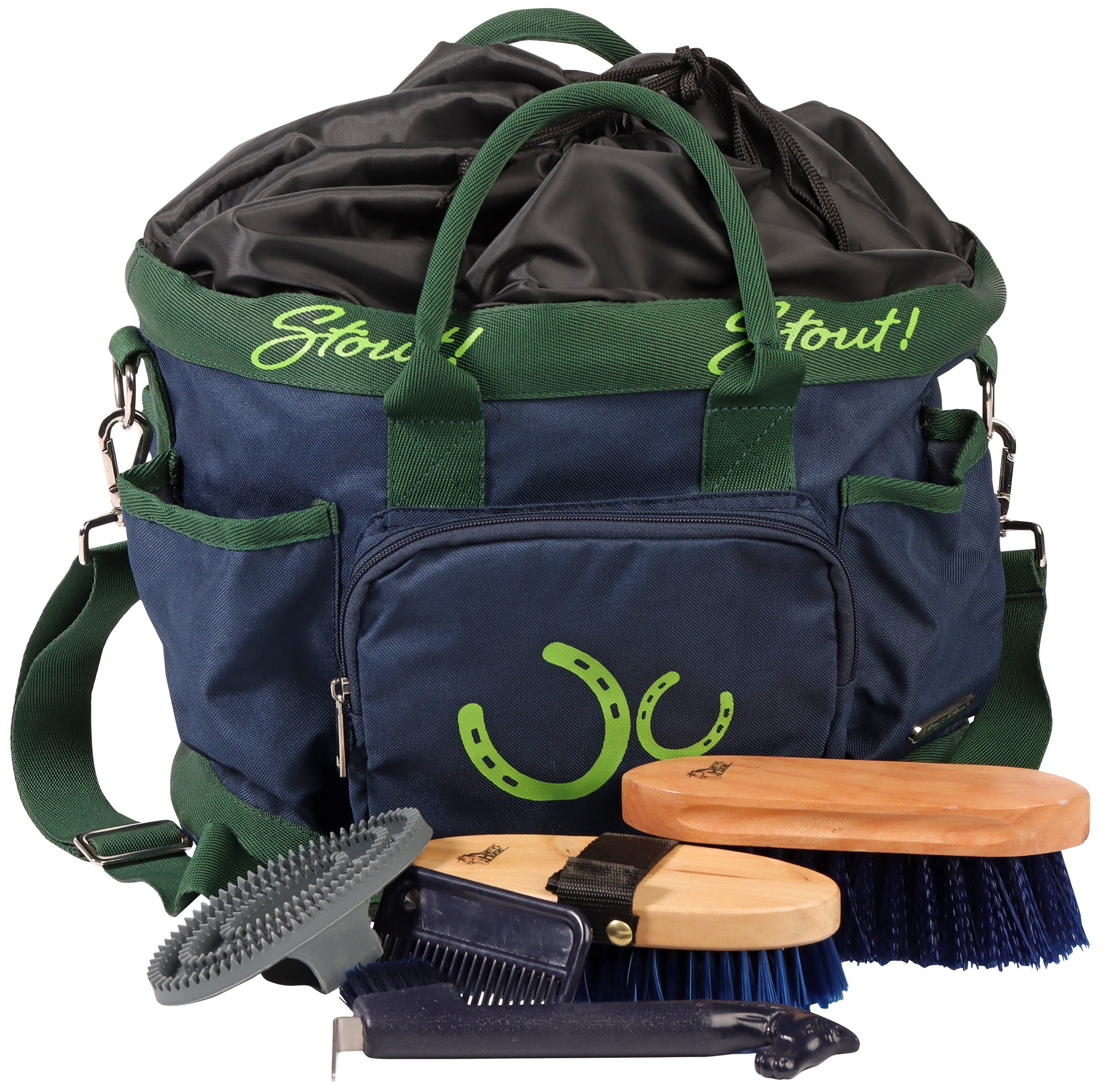 Poetstas met een koordsluiting en diverse vakken aan de buitenkant. Voorzien van leuke gekleurde details en het STOUT! logo op de zijkant. Compleet met een rubberen rosborstel, harde borstel, hoevenkrabber, glansborstel en een manenkam. Afmetingen: 33x20x22 cm Materiaal: 100% polyester