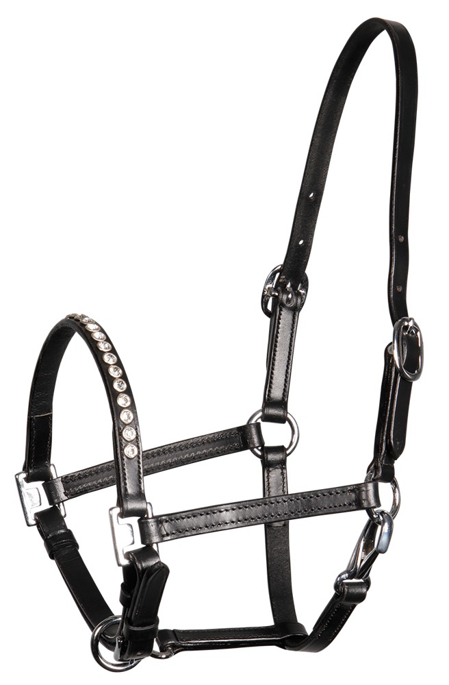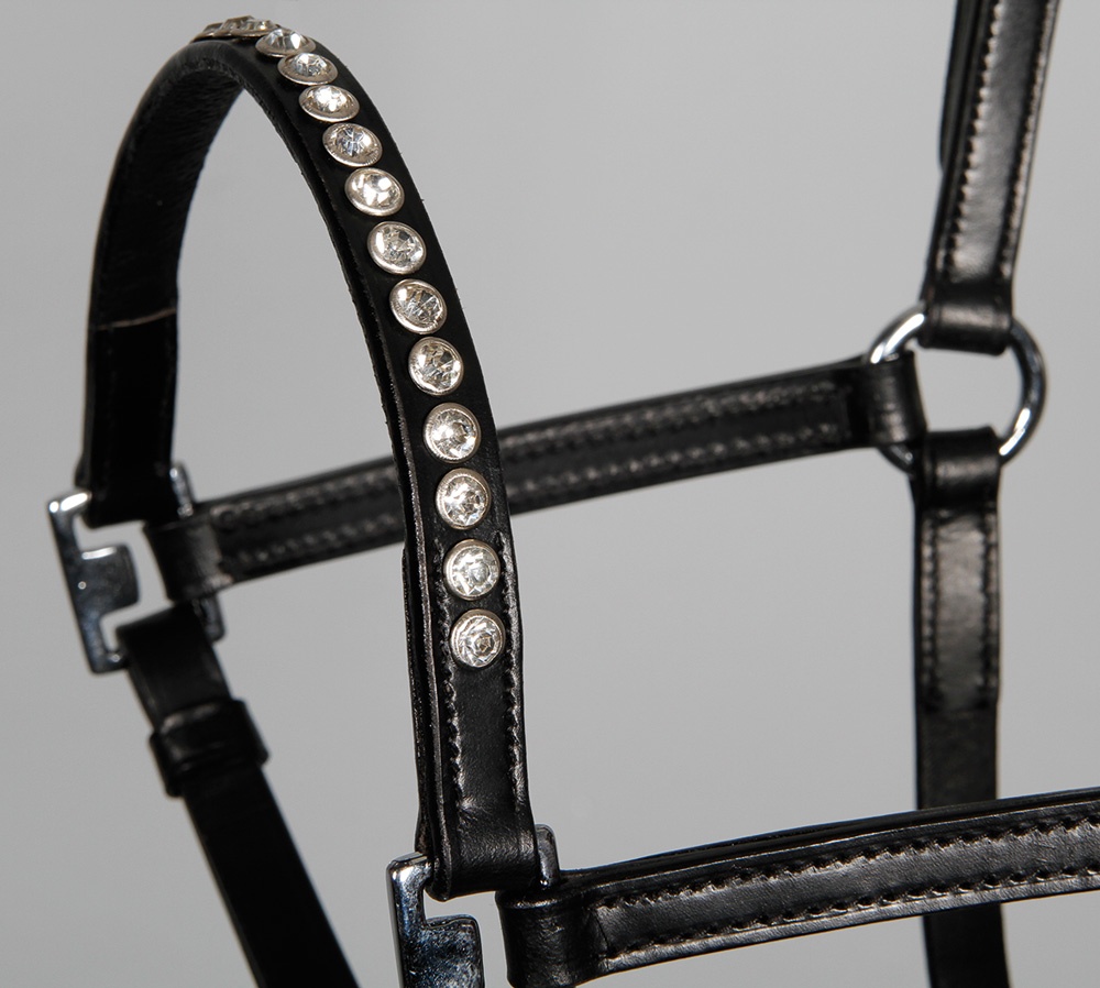 Mooi lederen halster met schitterende kristallen. Verstelbaar aan 2 kanten van het hoofd en op de kin. Verchroomde fournituren.