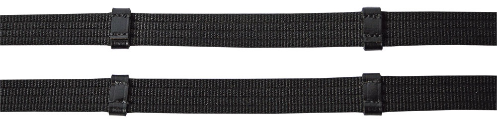 Teugels webband met lederen stops en nikkel gespen. Met blinde sluitingen. Breedte tussen stops 14cm. Verkrijgbaar in: Pony: 125cm Cob: 130cm Full: 135cm X-Full: 145cm (alleen zwart)