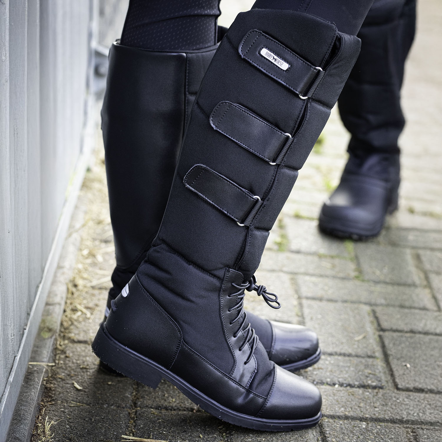 Thermolaars met elastische vetersluiting op de wreef, 3 klittenband sluitingen, reflectie op de bovenste sluiting en op de hiel van de laars. Mooie smalle voet wat de laars ook geschikt maakt om mee te rijden.