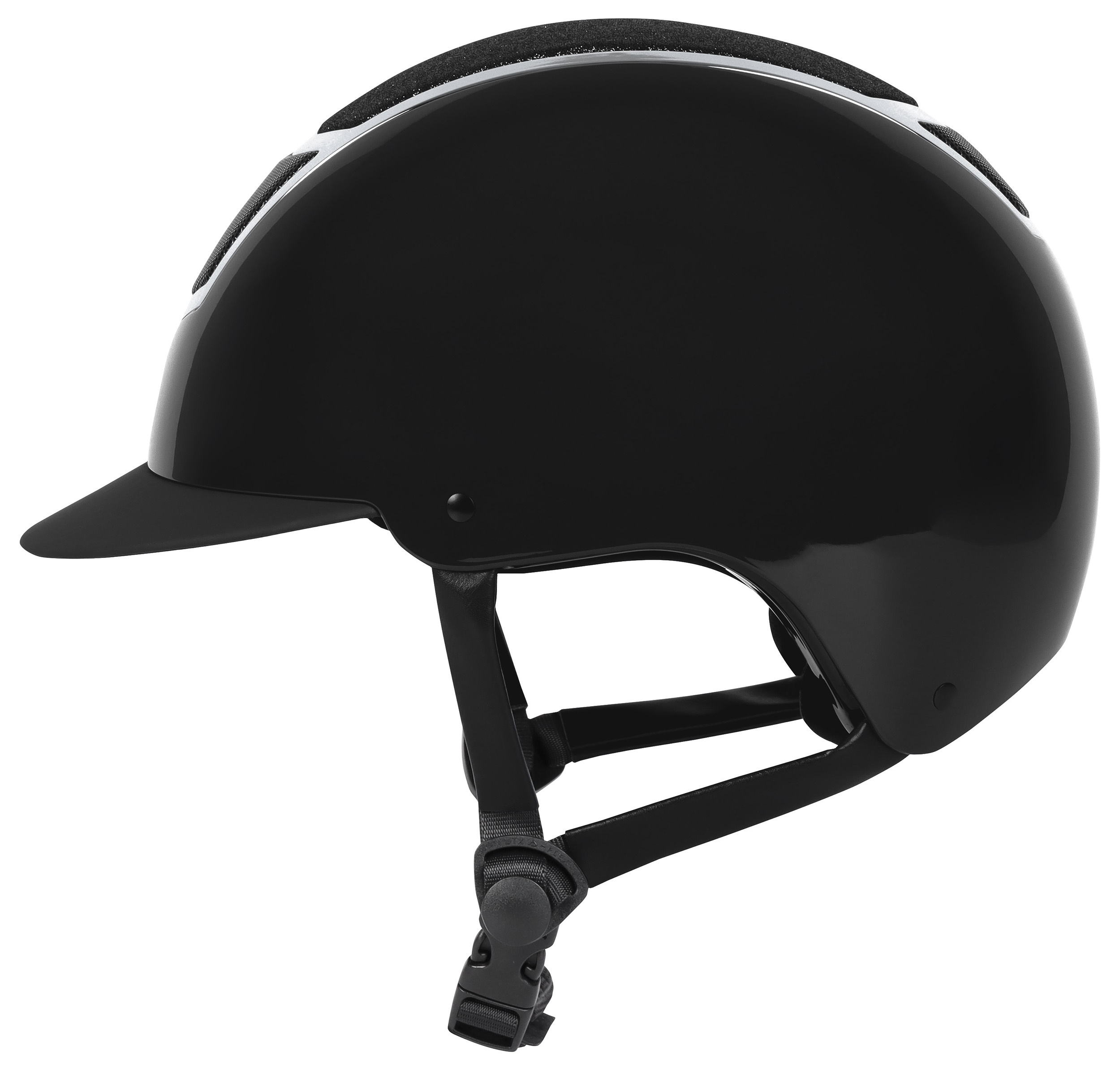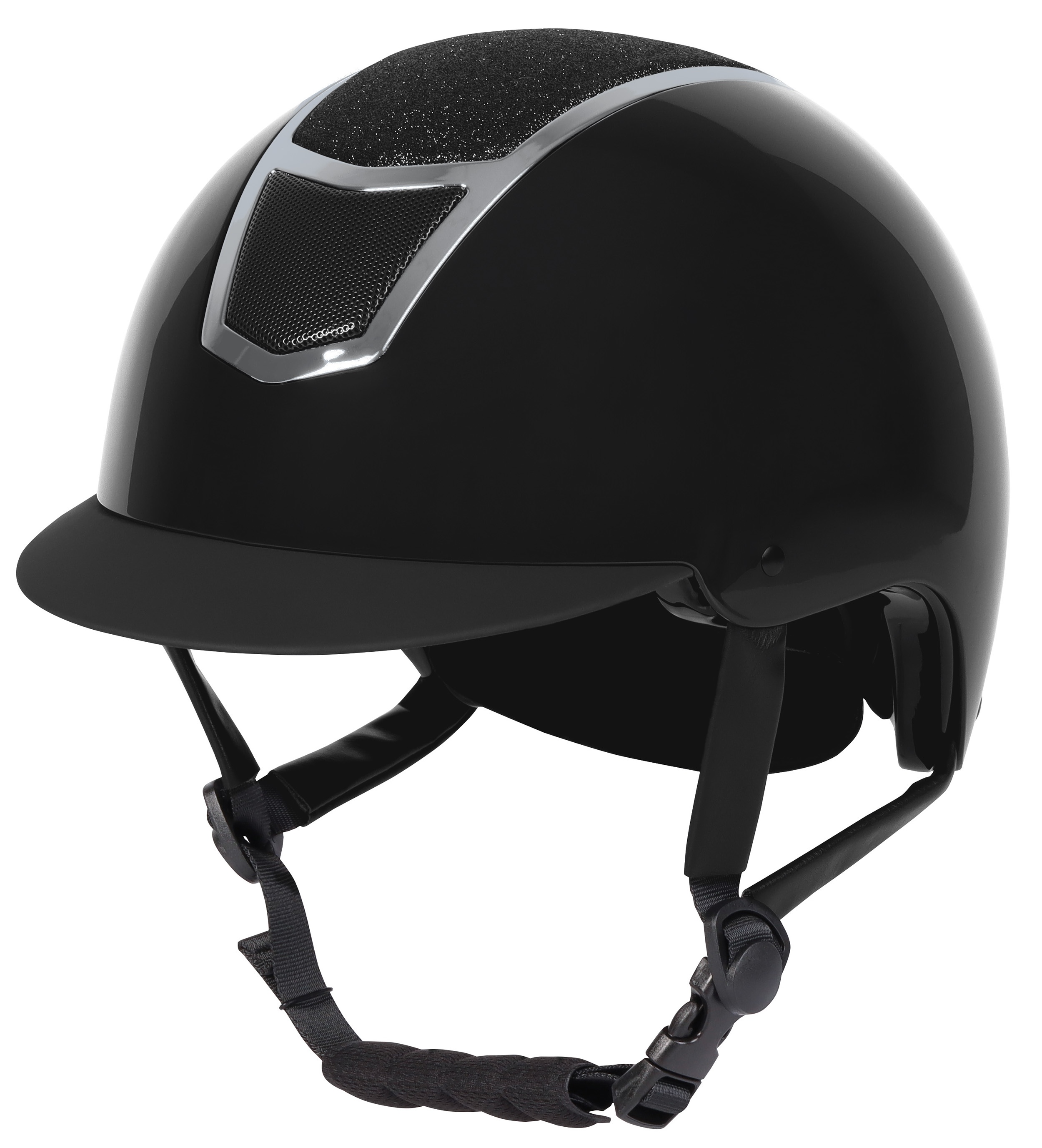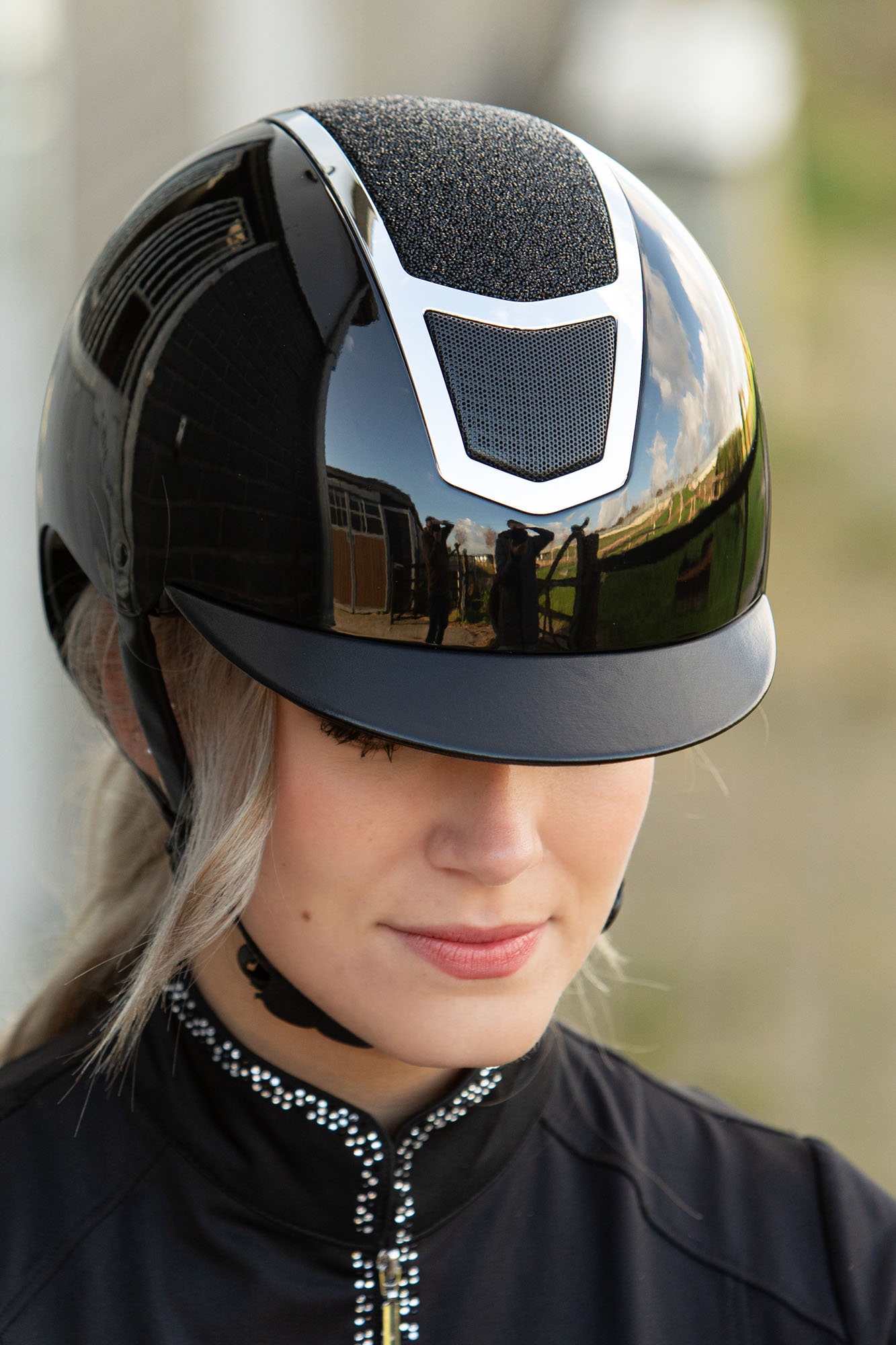 Met uitneembare en wasbare voering. Eenvoudig op maat te stellen door middel van een draaiknop. Tevens voorzien van meerdere ventilatiesleuven. De buitenschaal heeft een hoogglans finish en de middelste strook is voorzien van kristallen. Voldoet aan de EN1384:2023 norm.