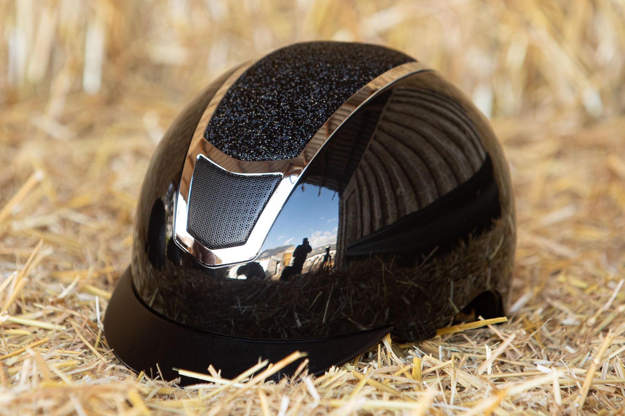 Met uitneembare en wasbare voering. Eenvoudig op maat te stellen door middel van een draaiknop. Tevens voorzien van meerdere ventilatiesleuven. De buitenschaal heeft een hoogglans finish en de middelste strook is voorzien van kristallen. Voldoet aan de EN1384:2023 norm.