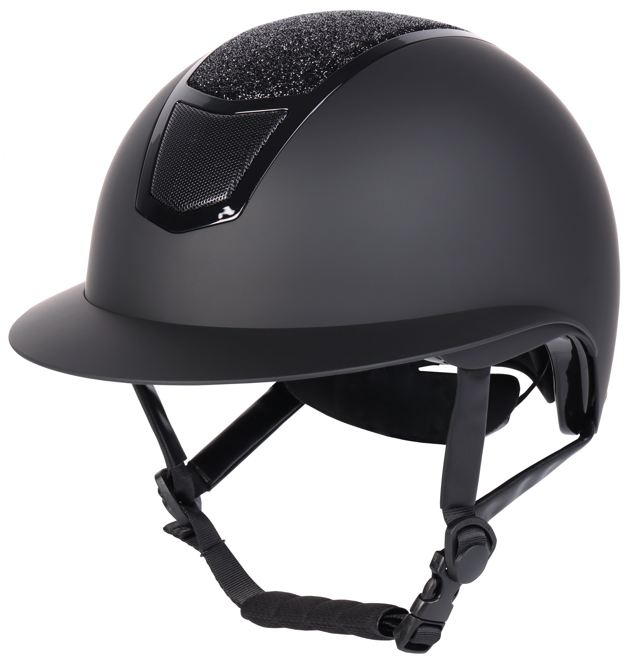 Met een uitneembare en wasbare voering. Eenvoudig op maat te stellen door middel van een draaiknop. Tevens is de veiligheidscap voorzien van meerdere ventilatiesleuven. De buitenschaal heeft een matte afwerking en de middelste strook is royaal afgewerkt met glinsterende details. Dit model heeft een brede klep voor bescherming tegen de zon en regen. Voldoet aan de EN1384:2023 norm.
