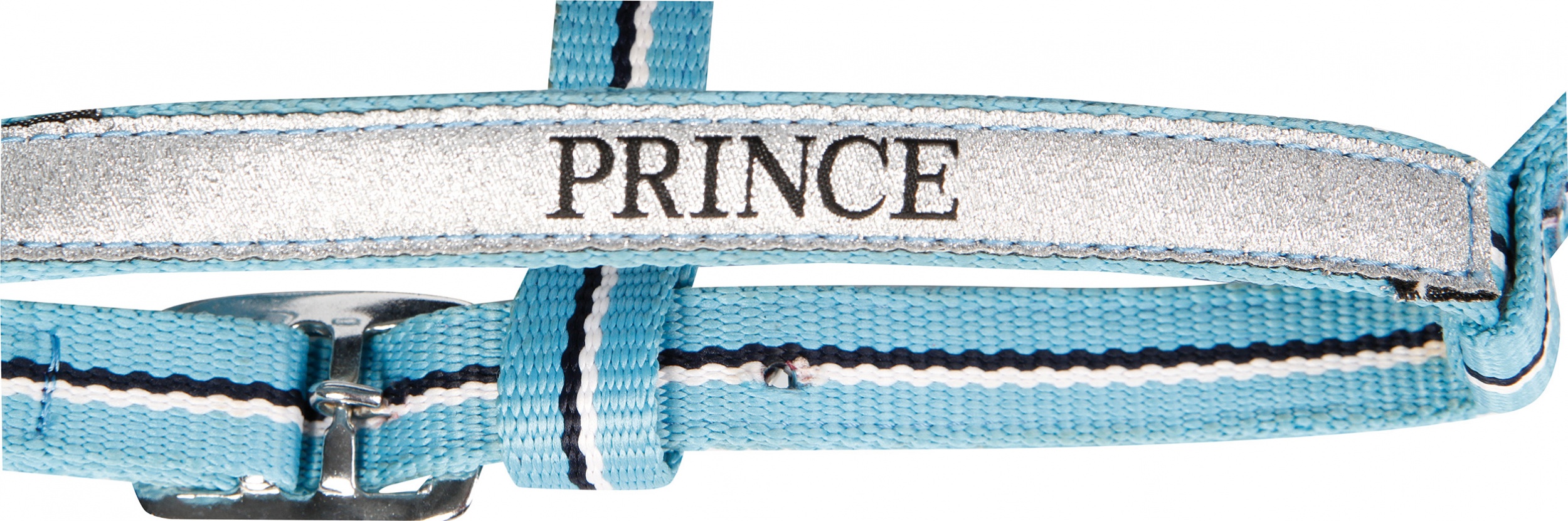 Opties Halster voor veulens, bijpassend verkrijgbaar halster voor de merrie, zilverkleurige band op de neus met "PRINCE" op de lichtblauwe en "PRINCESS" op de roze versie, verstelbaar aan het kopstuk en onder de kin, inclusief halstertouw.