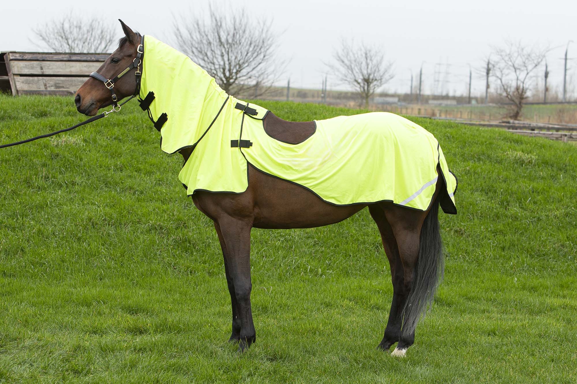 Mesh pro deken te gebruiken tijdens het rijden. Voorzien van een zadeluitsparing, staartflap en een afneembaar halsdeel. De deken is gemaakt van een reflecterende stof en heeft verder een reflecterende bies op de flank en op de staartflap. Materiaal: 100% polyester.
