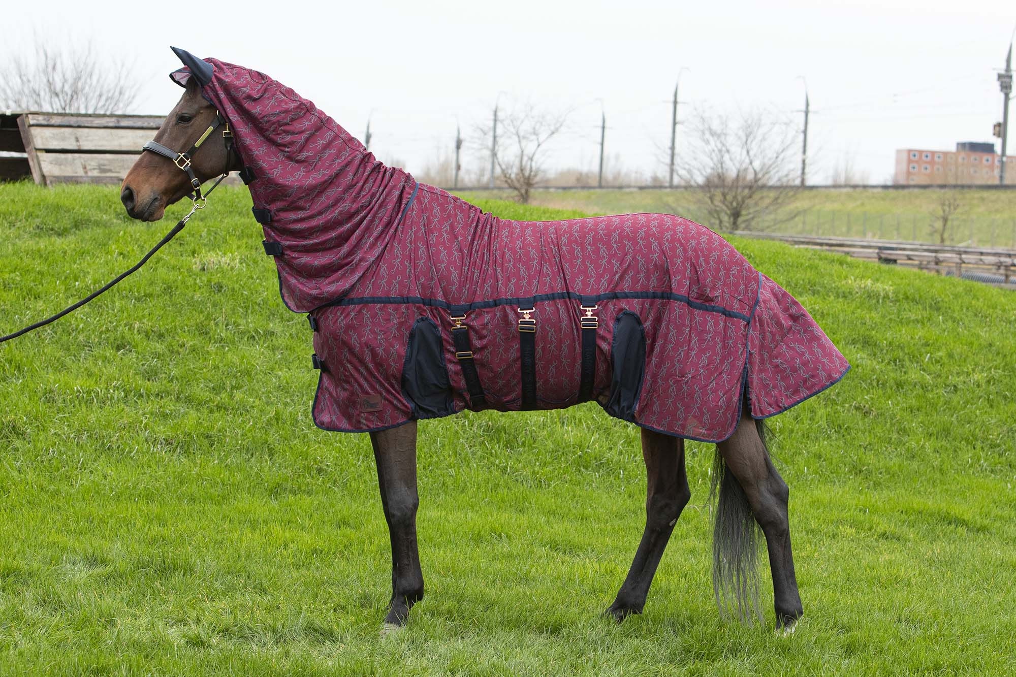 Mesh deken te gebruiken als vliegendeken of cooler deken, voorzien van een dubbele voorsluiting, vaste hals met drie sluitingen en voering om de manen te beschermen, buiksingel, extra brede staartflap en staartlus, borst is polyester gevoerd.Met een luxe alloverprint. 100% polyester