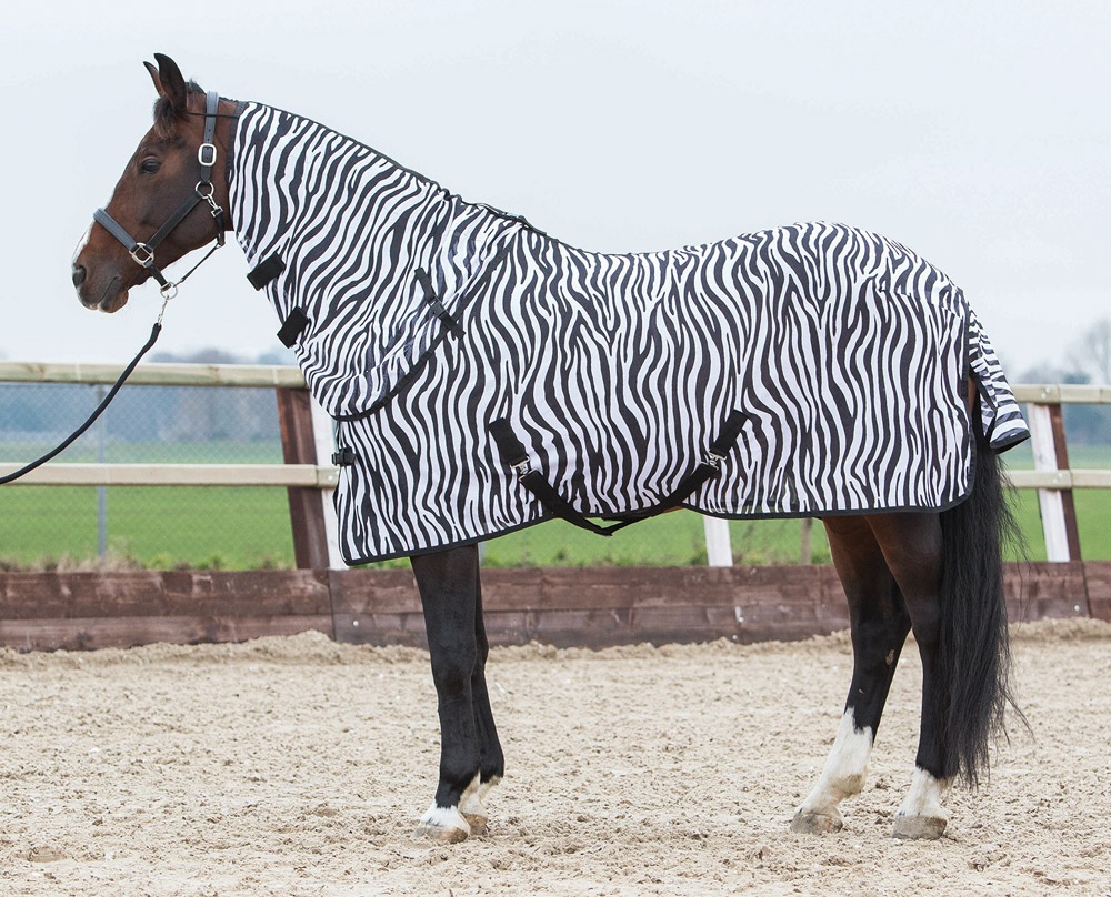 Vliegendeken met afneembare hals en zebraprint. De hals en de deken zijn eenvoudig en snel te sluiten door clipsluitingen. Inclusief kruissingels en bilkoorden. 100% polyester