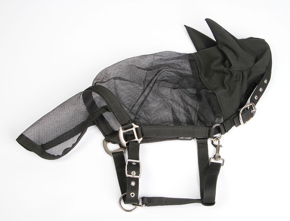 Halster met vliegenkap combi is een halster voorzien van een fijnmazige vliegenkap. Halster met zilverkleurige fournituren. Verstelbaar op drie plaatsen: bij de hals, keel en de kaak. Gaatjes zijn voorzien van ringen. Model met oren. Geheel gevoerd met domy suede. Materiaal: polypropyleen.