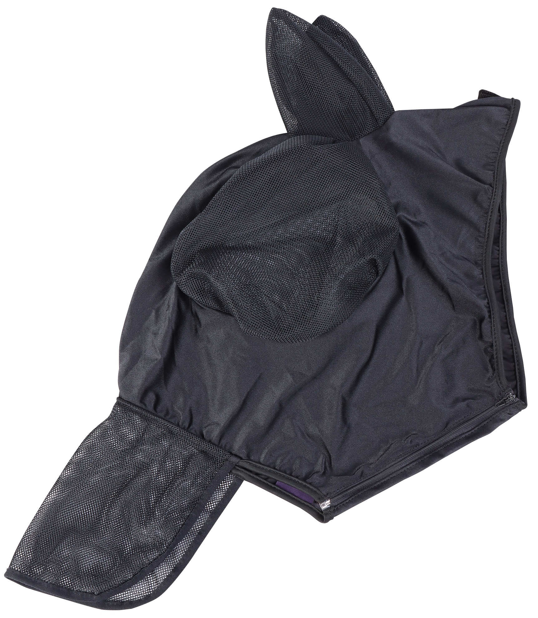 Elastisch vliegenmasker. De stof rond de de ogen, de neus en de oren is van soepel zwart gaas. Voorzien van een ritssluiting aan de onderkant en een gat om de voorpluk doorheen te doen. Kan ook onder een hoofdstel gebruikt worden. Materiaal: Polyester.