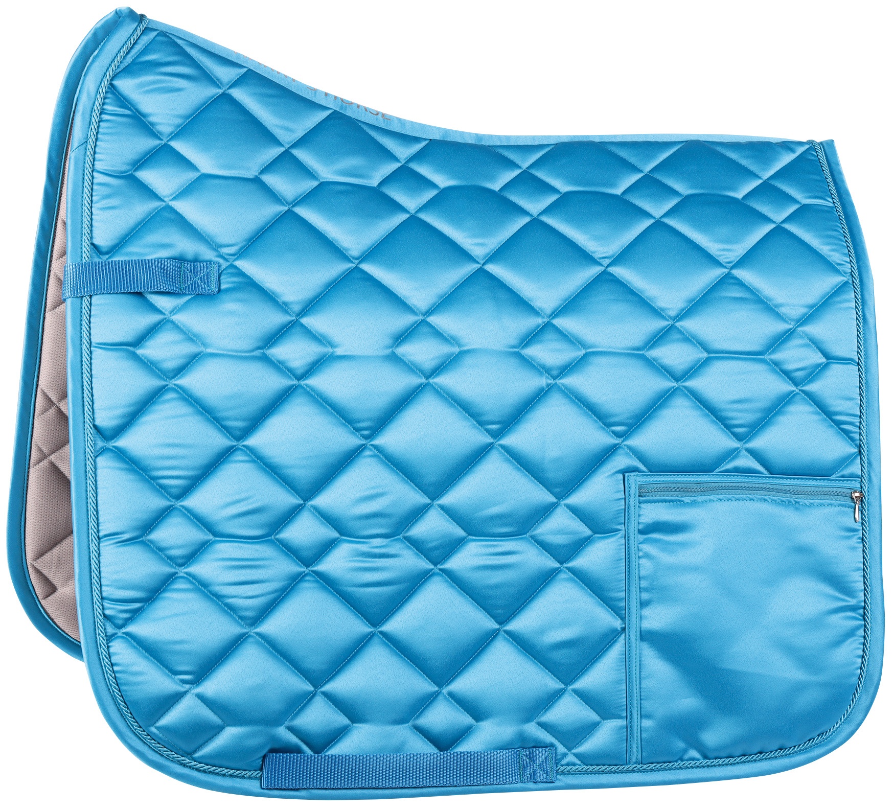 Opties Zadeldek van een luxe satijn stof met een zak met ritssluiting op de linkerkant waarin je jouw persoonlijke spullen op kan bergen tijdens het paardrijden. 100% polyester.