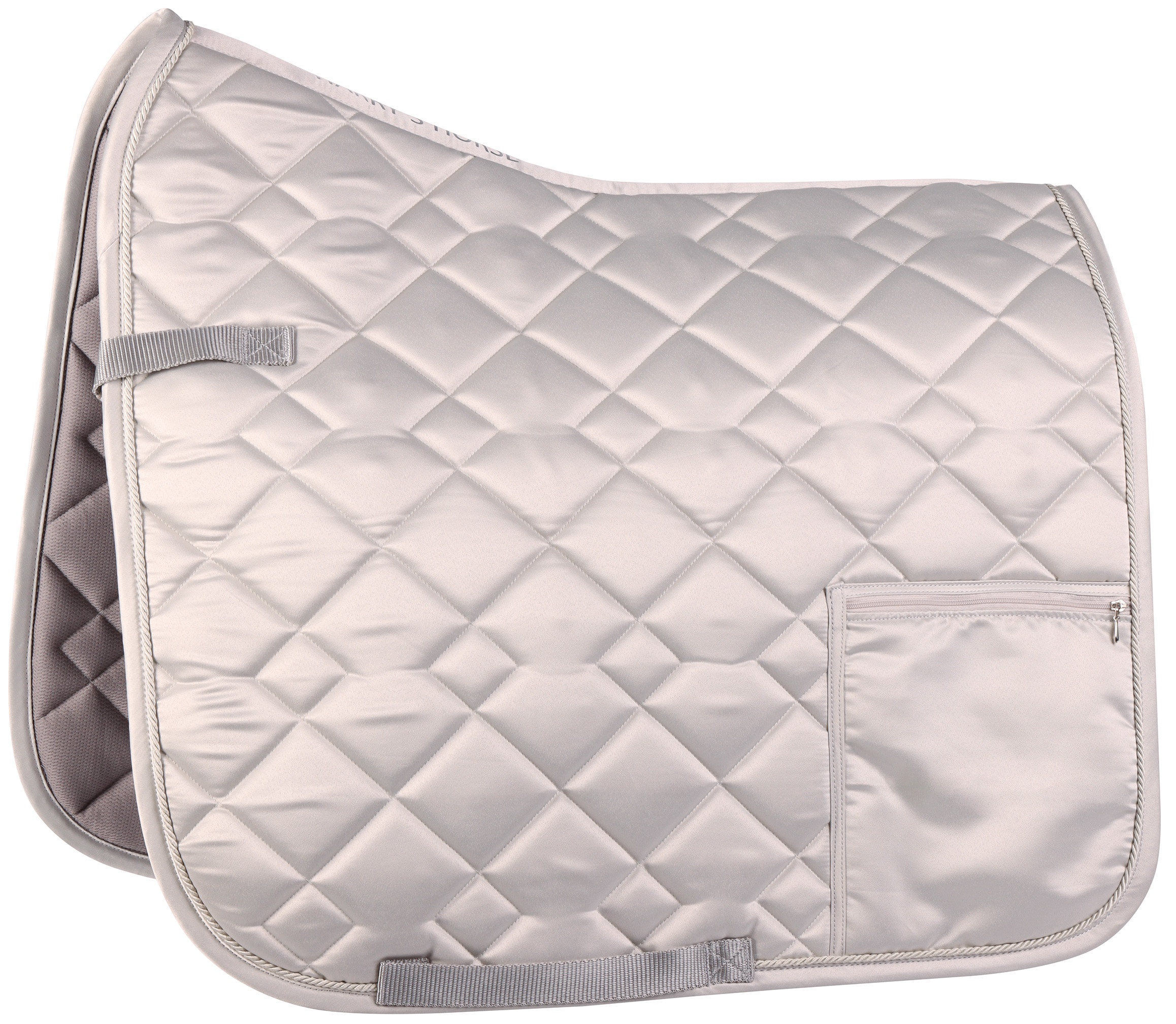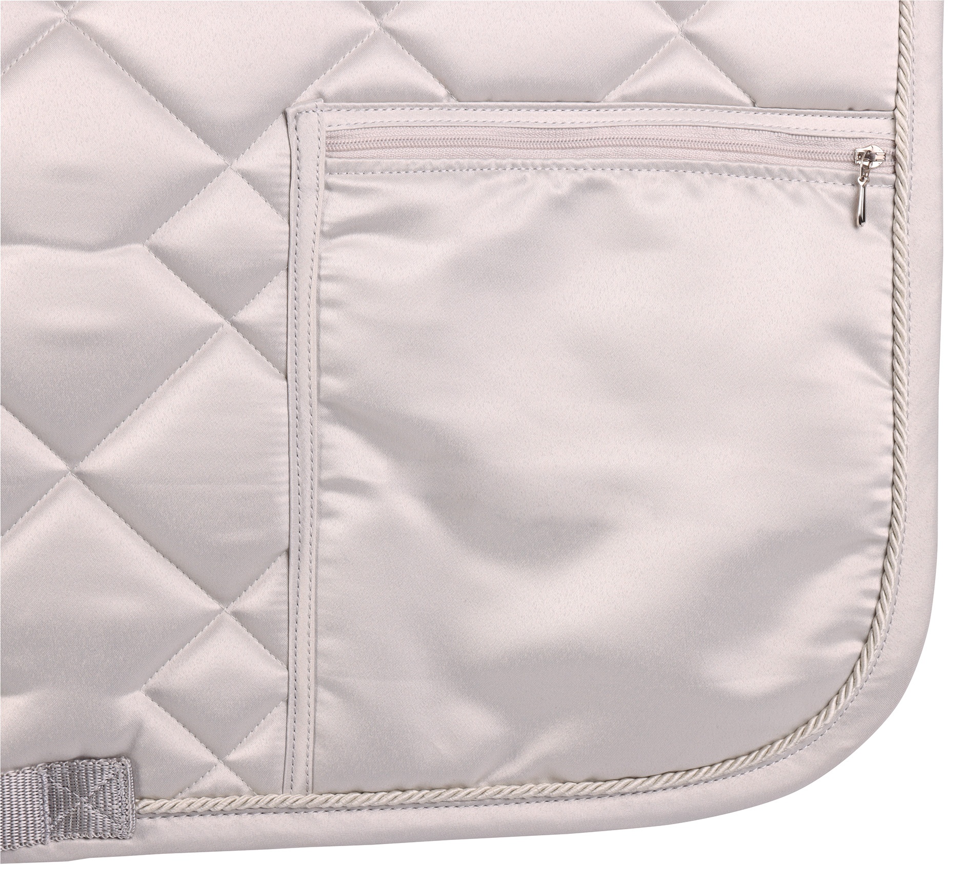 Zadeldek van een luxe satijn stof met een zak met ritssluiting op de linkerkant waarin je jouw persoonlijke spullen op kan bergen tijdens het paardrijden. 100% polyester.