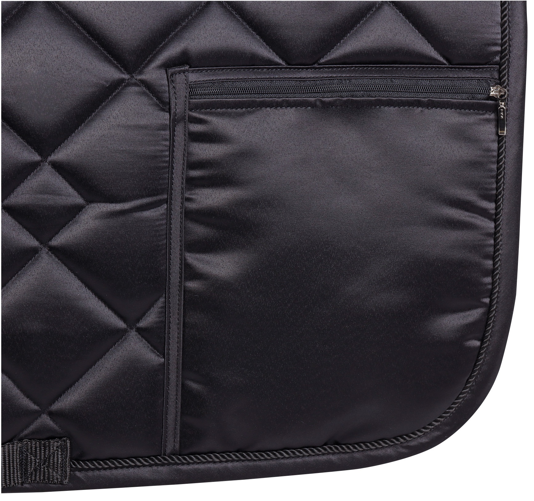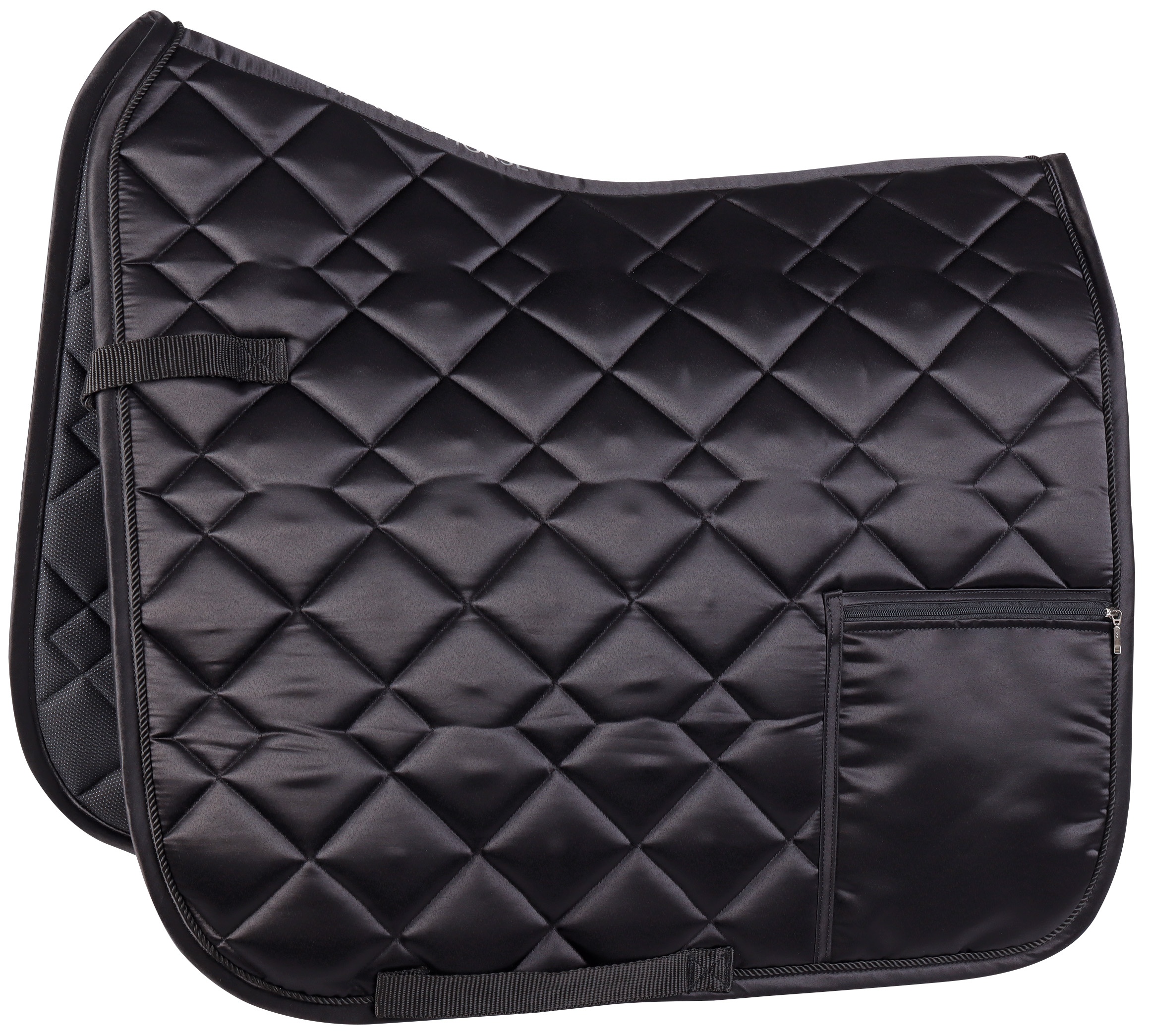 Zadeldek van een luxe satijn stof met een zak met ritssluiting op de linkerkant waarin je jouw persoonlijke spullen op kan bergen tijdens het paardrijden. 100% polyester.