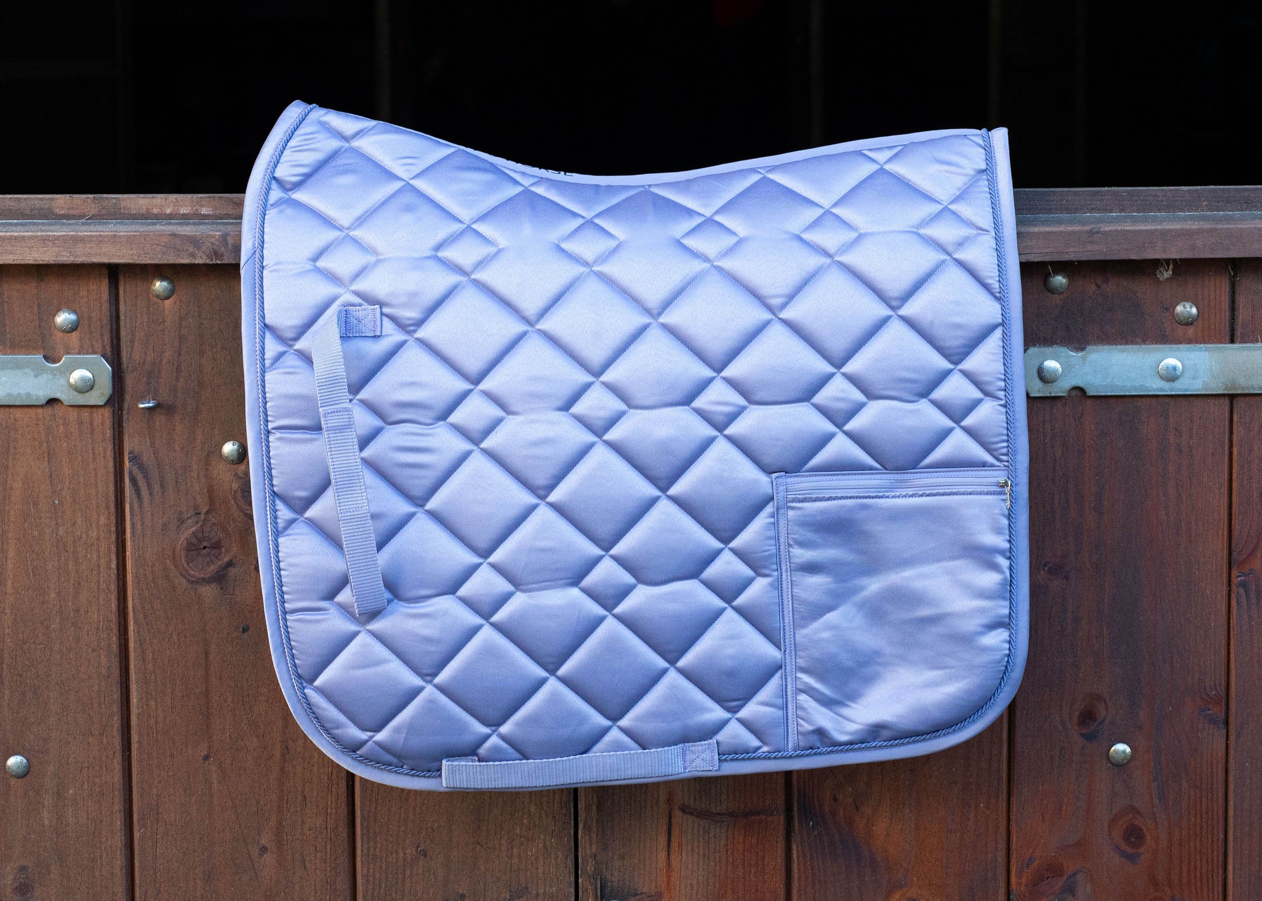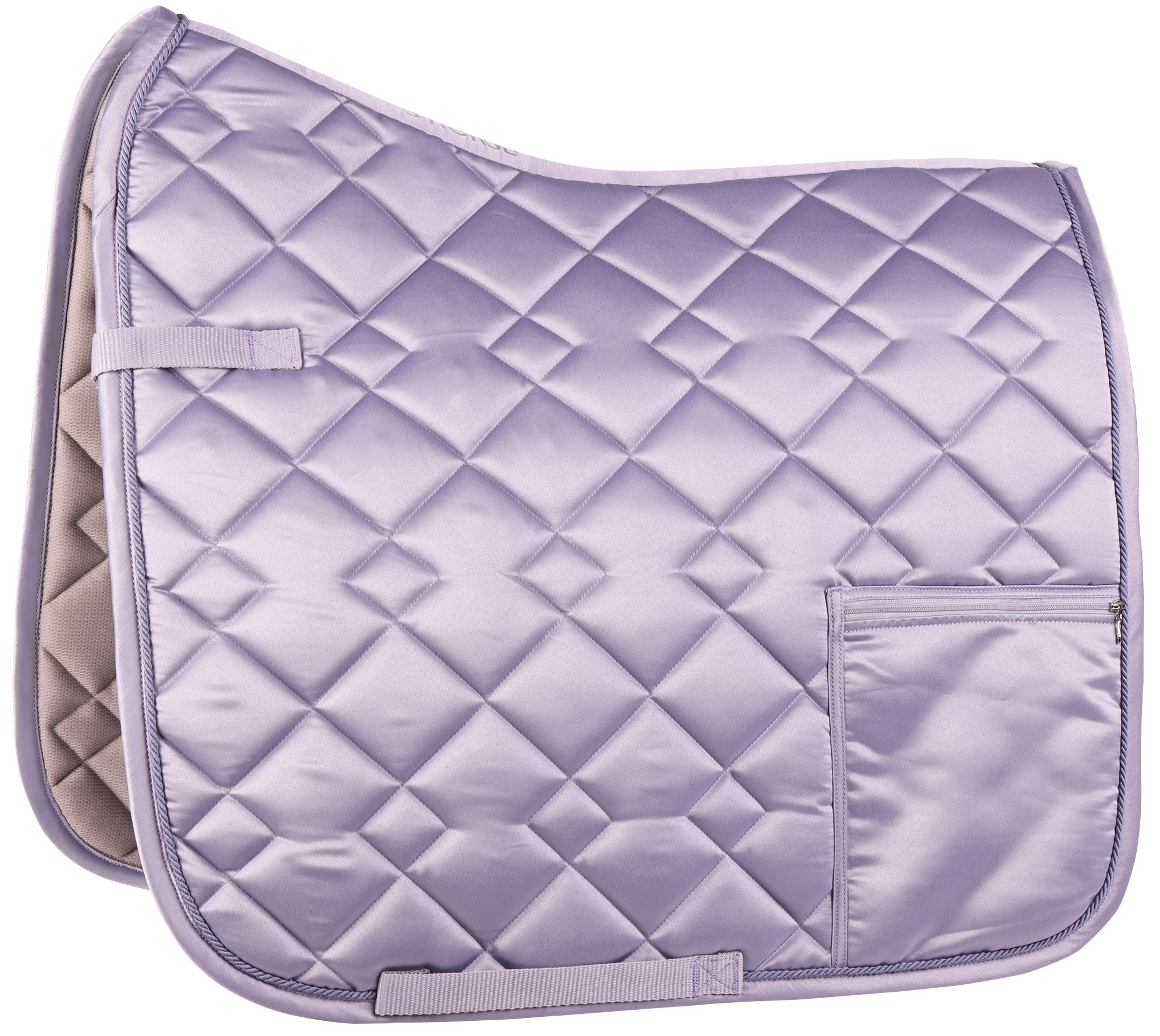 Zadeldek van een luxe satijn stof met een zak met ritssluiting op de linkerkant waarin je jouw persoonlijke spullen op kan bergen tijdens het paardrijden. 100% polyester.