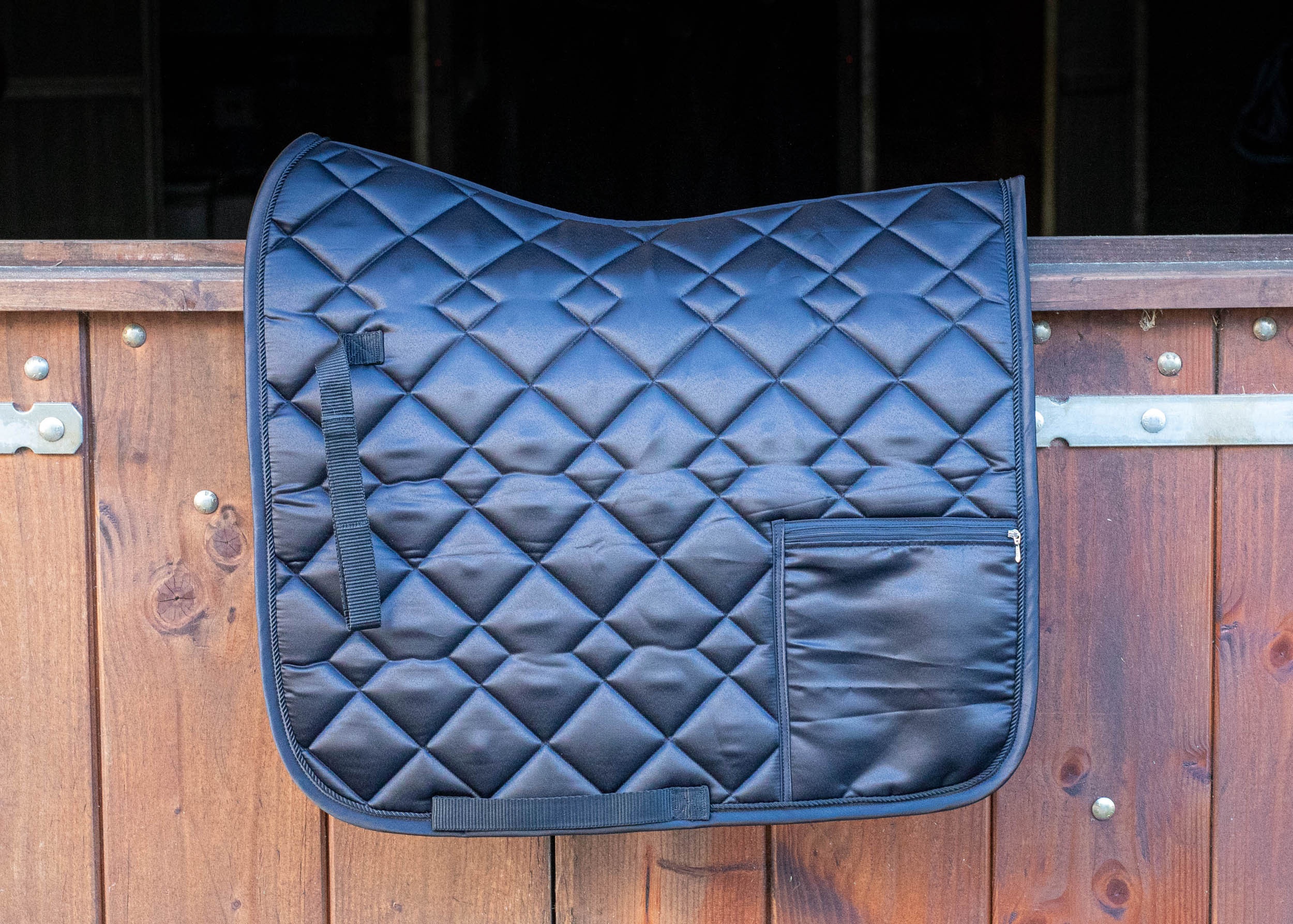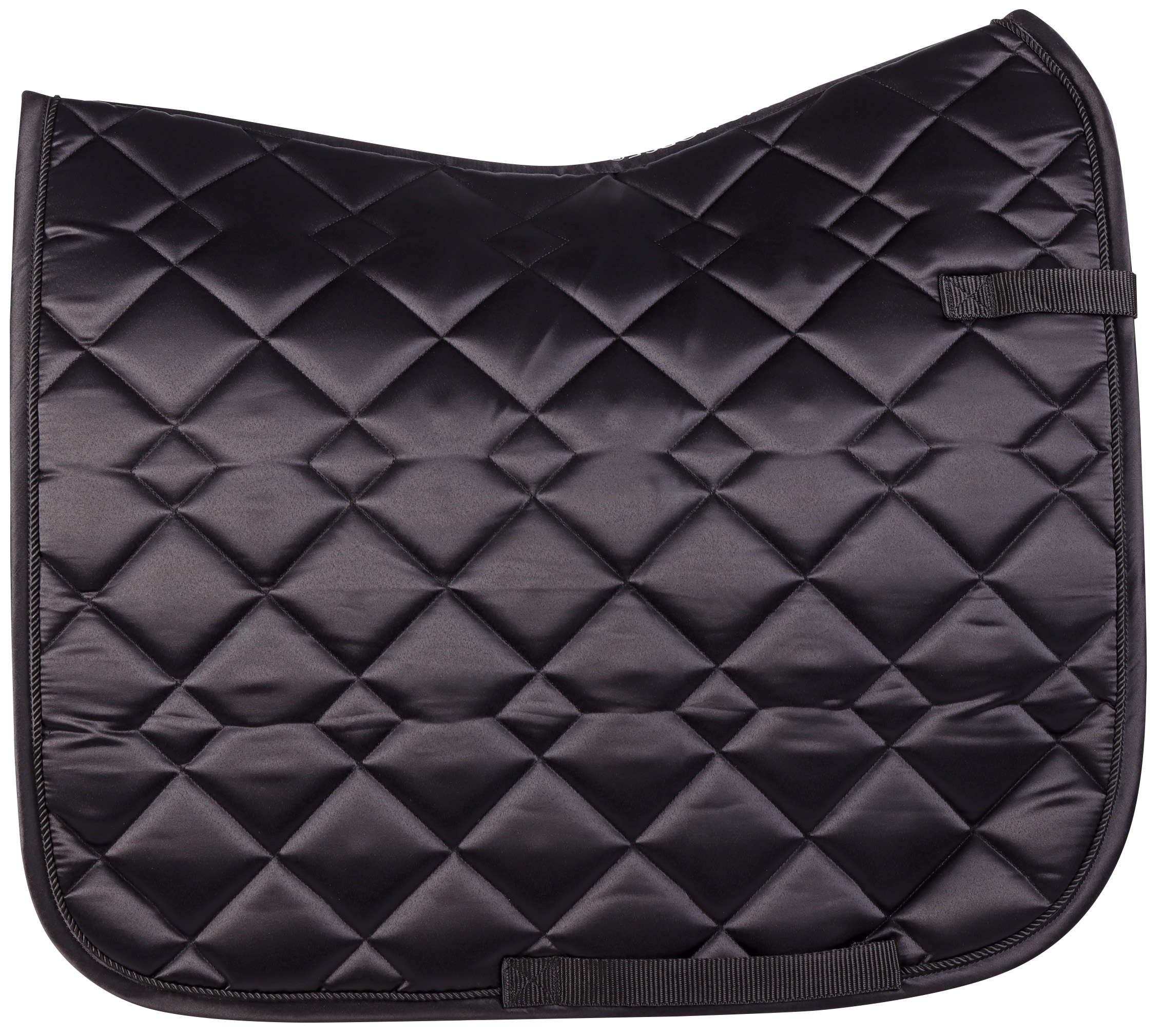 Opties Zadeldek van een luxe satijn stof met een zak met ritssluiting op de linkerkant waarin je jouw persoonlijke spullen op kan bergen tijdens het paardrijden. 100% polyester.