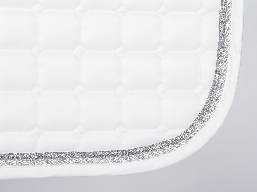 Zadeldek in luxueus High Density Twill materiaal. Voorzien van een koord en glitter binding. Uitgerust met een singellus en klittenband op de zadellussen. Materiaal: Buitenzijde: High Density Twill (100% polyester) Voering: mesh