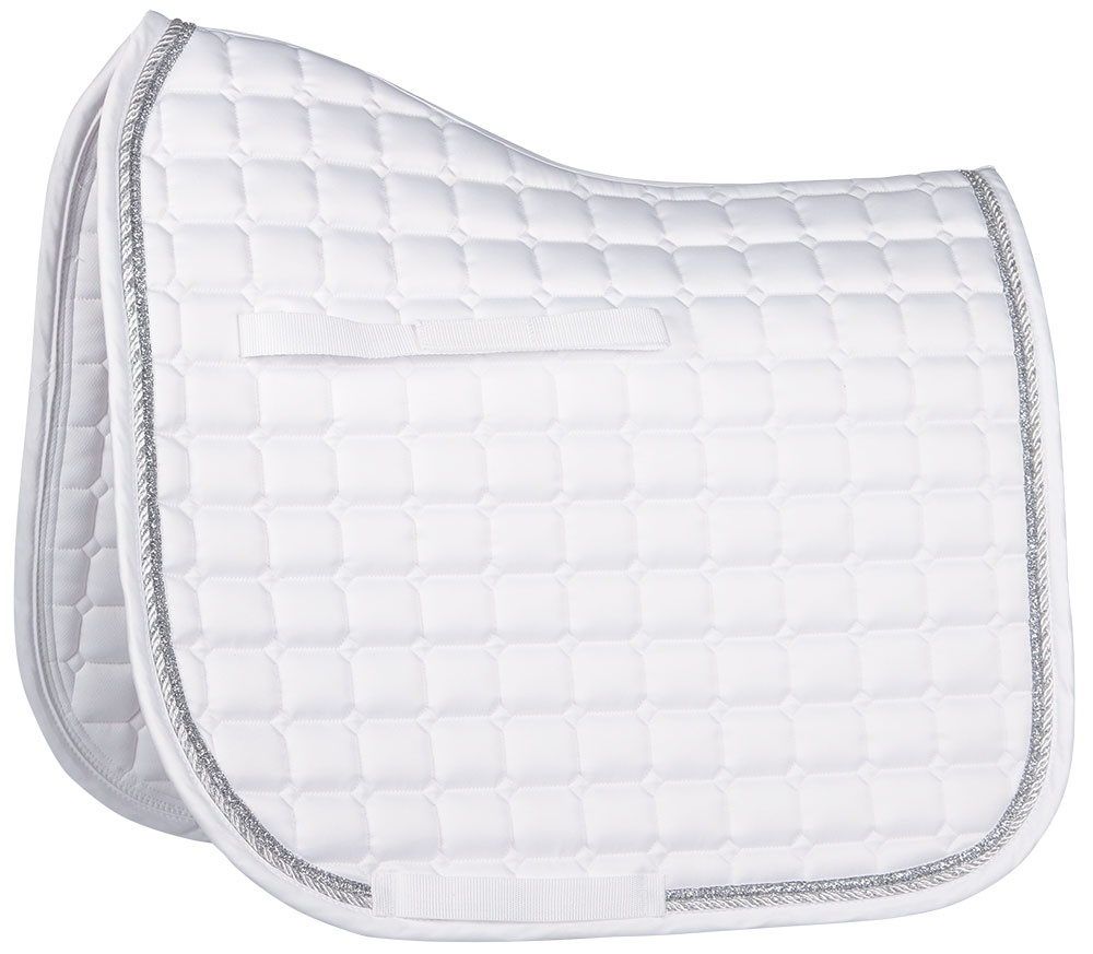 Zadeldek in luxueus High Density Twill materiaal. Voorzien van een koord en glitter binding. Uitgerust met een singellus en klittenband op de zadellussen. Materiaal: Buitenzijde: High Density Twill (100% polyester) Voering: mesh