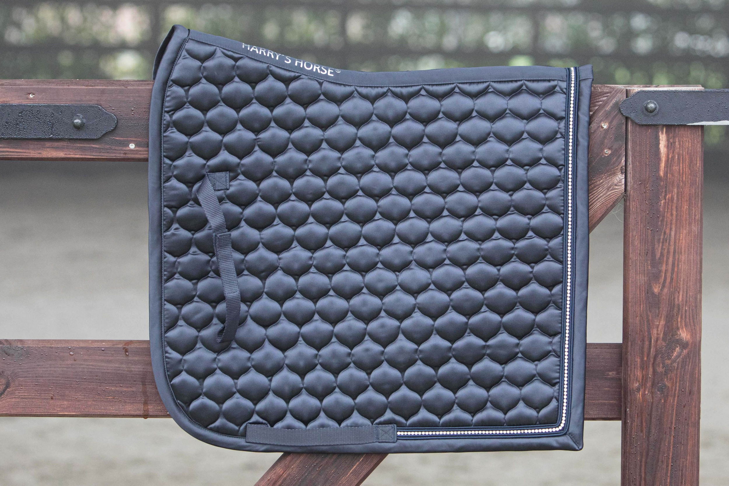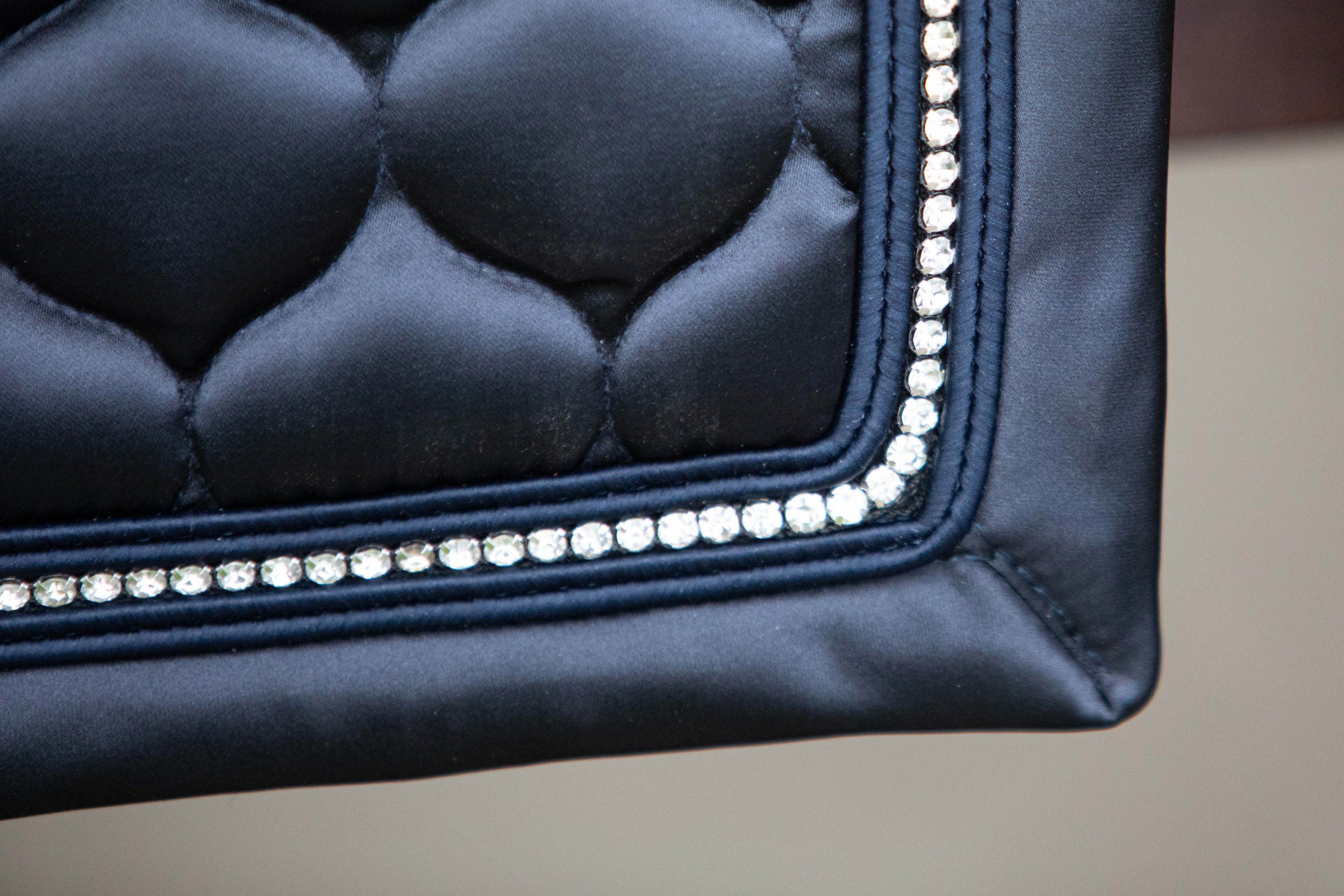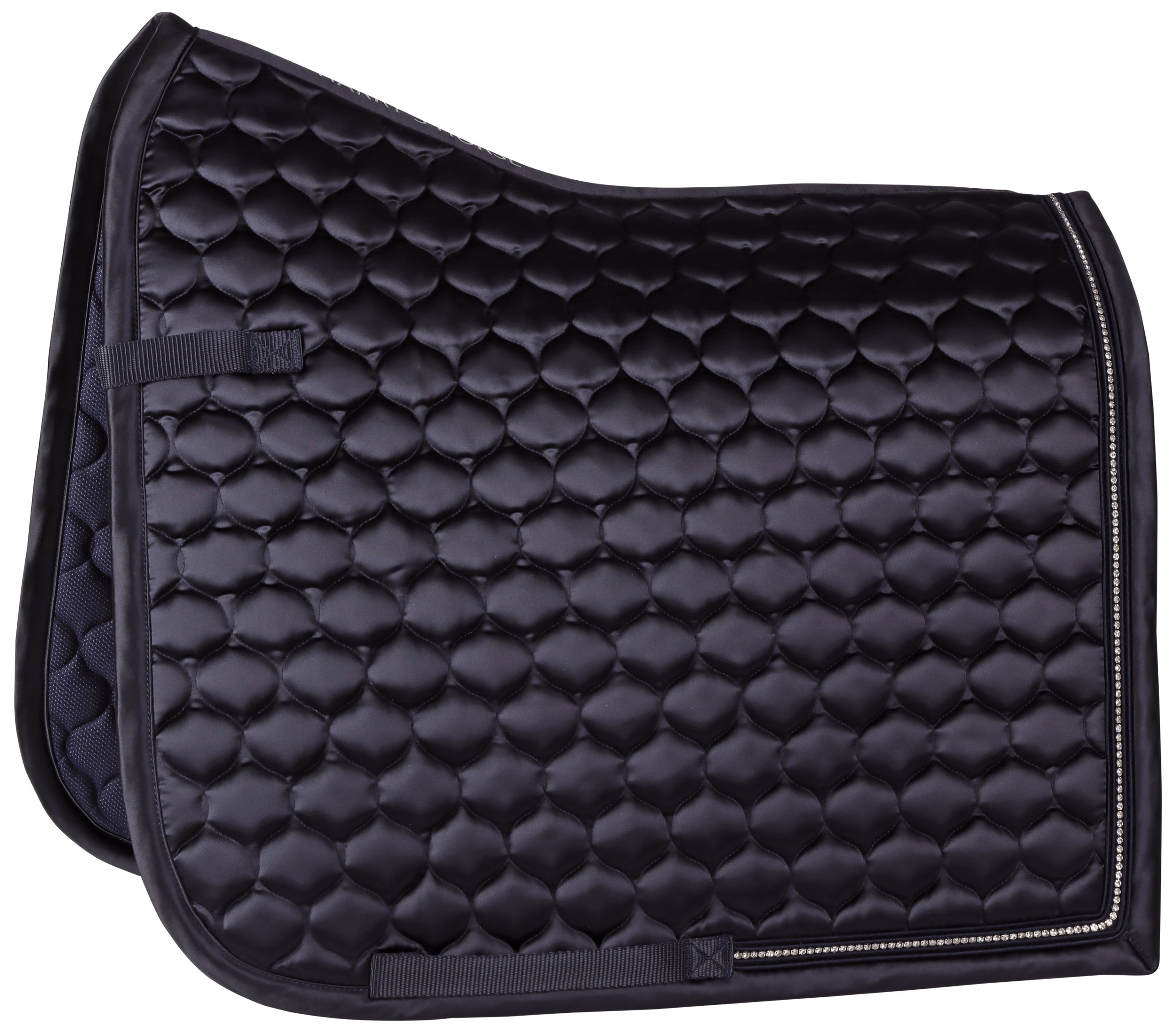 Satijn zadeldek met een koord en een rij kristallen aan de achterzijde van het zadeldek, singel- en zadellussen en coolmesh voering. Materiaal; 100% polyester - 10mm foam/250gr polyfill - coolmesh lining.