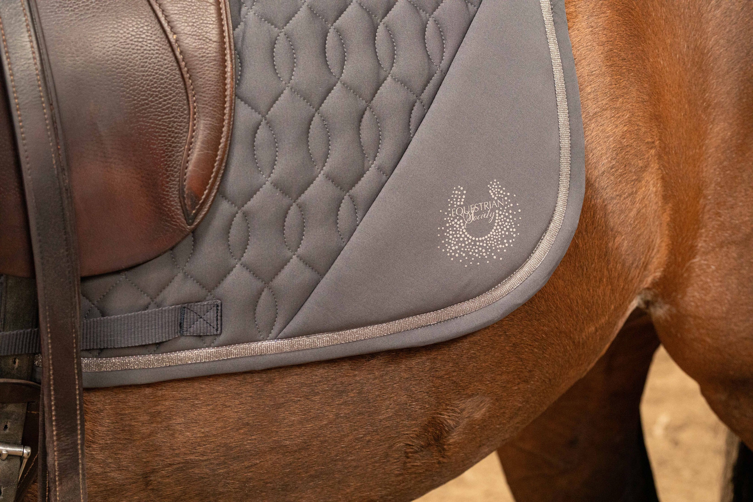Zadeldek met rondom een glitterbies, verder voorzien van lussen voor je zadel en singel en met een sneldrogende meshstof voering. 100% polyester.