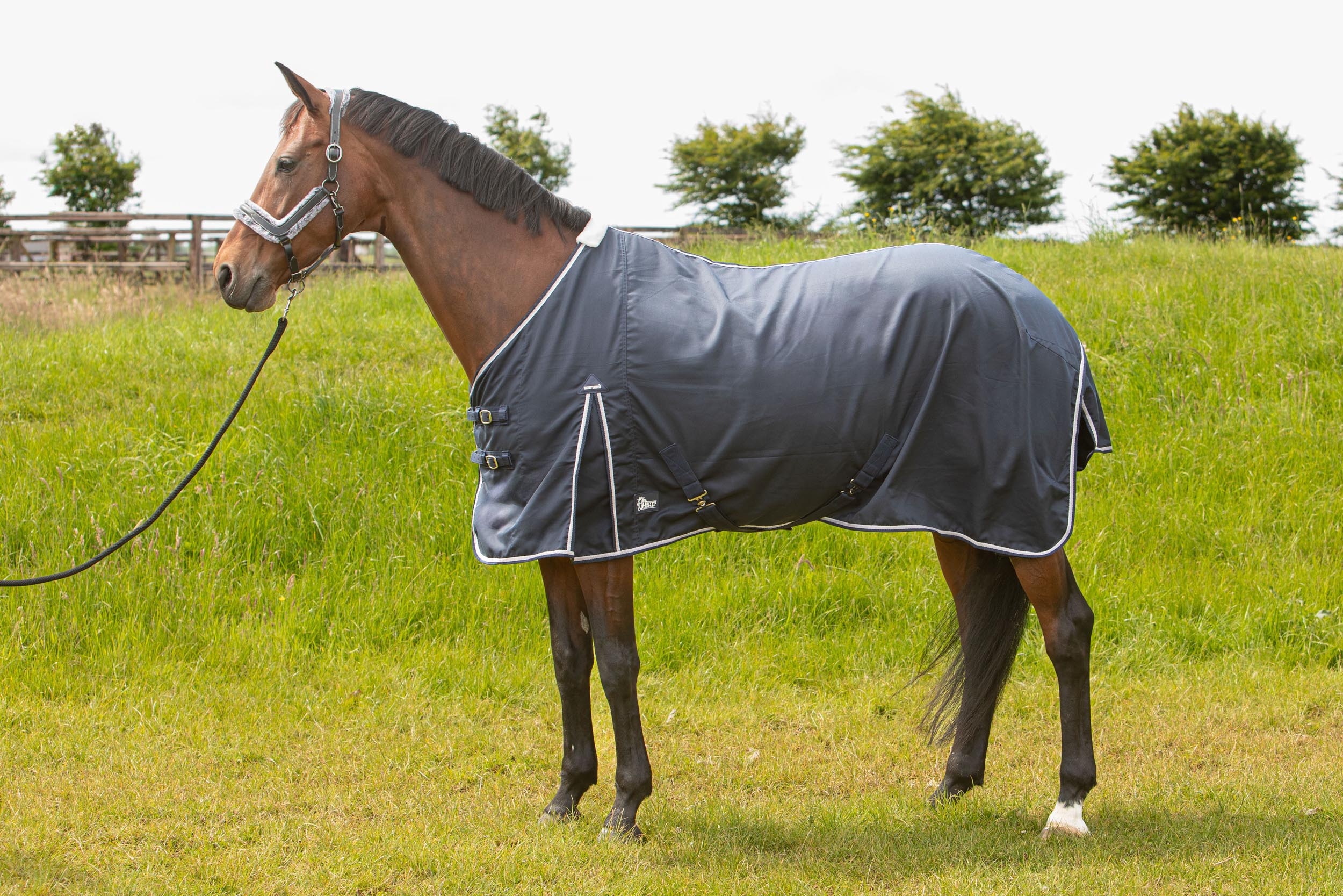 Zomerdeken van een comfortabele en soepele polyester. De deken heeft dubbele voorsluiting, kruissingels, afneembare bilkoorden en een staartflap. Kleur navy en afgewerkt met een offwhite-navy contrastbies. Materiaal: 100% polyester.