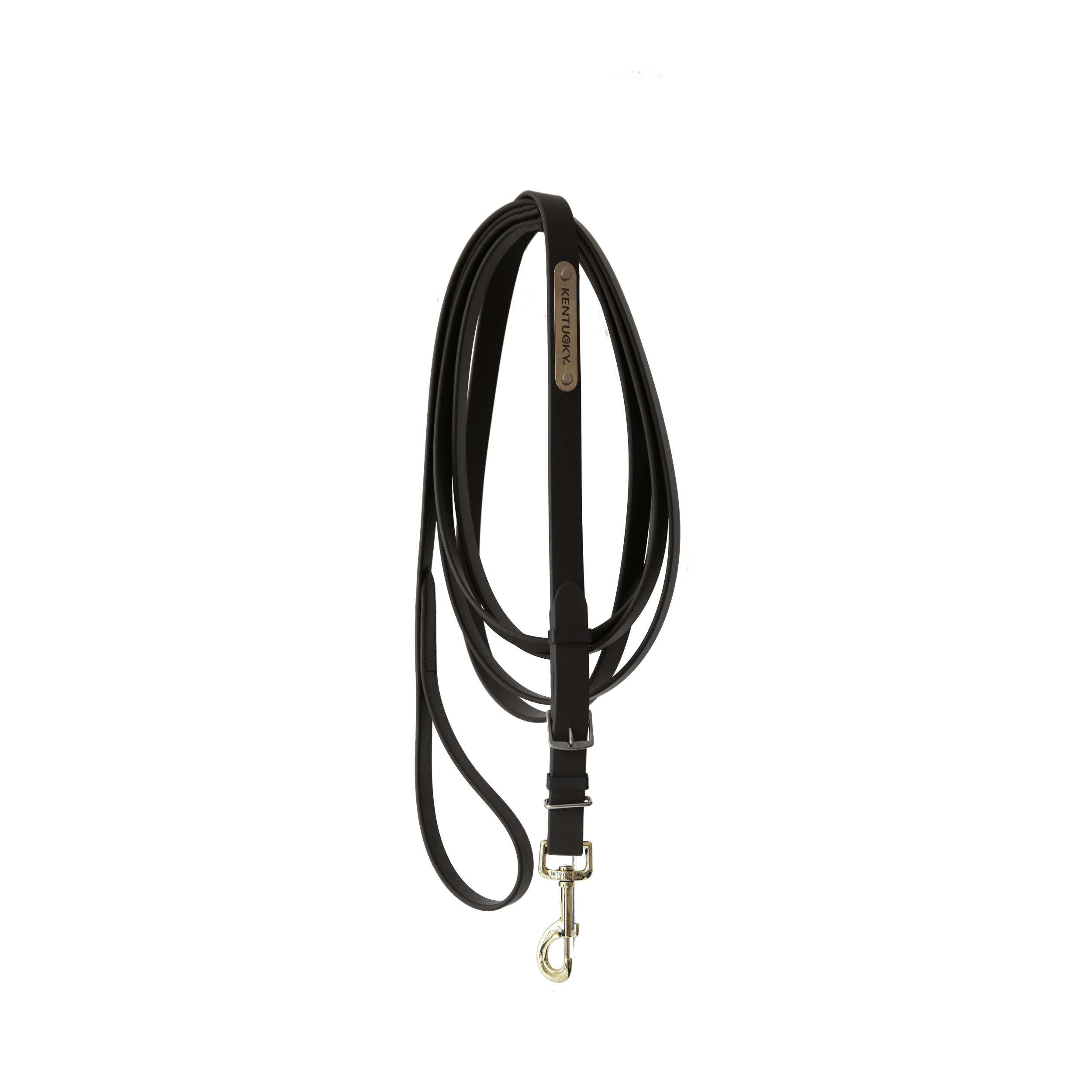 Onze hengstenlijn Stallion Lead is 4m lang en is gemaakt van polyurethaan. Dit zorgt ervoor dat de lijn extreem sterk doch flexibel (zelfs in koud weer) en aangenaam te hanteren is. De hengstenlijn rekt niet uit, is anti-slip en is zeer gemakkelijk te onderhouden aangezien deze waterresistent is. Het naamplaatje kan op de achterzijde gegraveerd worden. Dankzij zijn vele kwaliteiten is de hengstenlijn een goed en goedkoper alternatief dan andere dure leren presentatielijnen. De sluitingen van de hengstenlijn zijn goudkleurig zodat ze perfect bij al onze halsters passen. De haak kan gemakkelijk veranderd worden door een andere sluiting of een ketting. Daarom is de lijn ideaal in combinatie met onze 60cm lange Stallion Chain.
