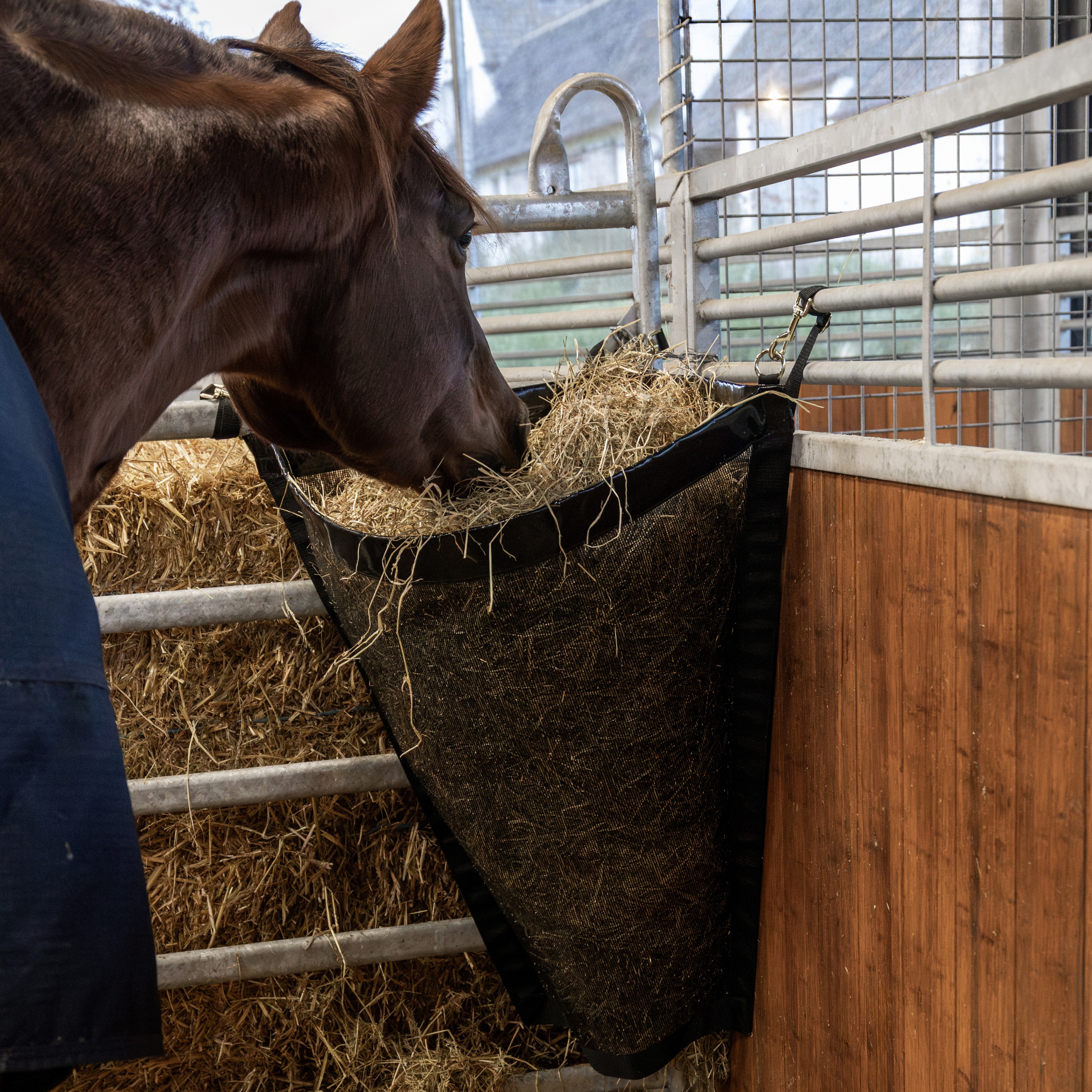 Deze hooizaak is afgestemd op de behoeften van uw paard en beperkt hooiverlies. Met een grote opening bovenaan en een praktische onderkant, kan uw paard gemakkelijk bij het hooi, waardoor het zonder moeite alles op kan eten. Gemaakt van robuuste, duurzame materialen die bestand zijn tegen dagelijks gebruik in de stal. Perfect voor het voeren van een ideale portie hooi: tot 8 kg (maat M) en tot 14 kg (maat L).
