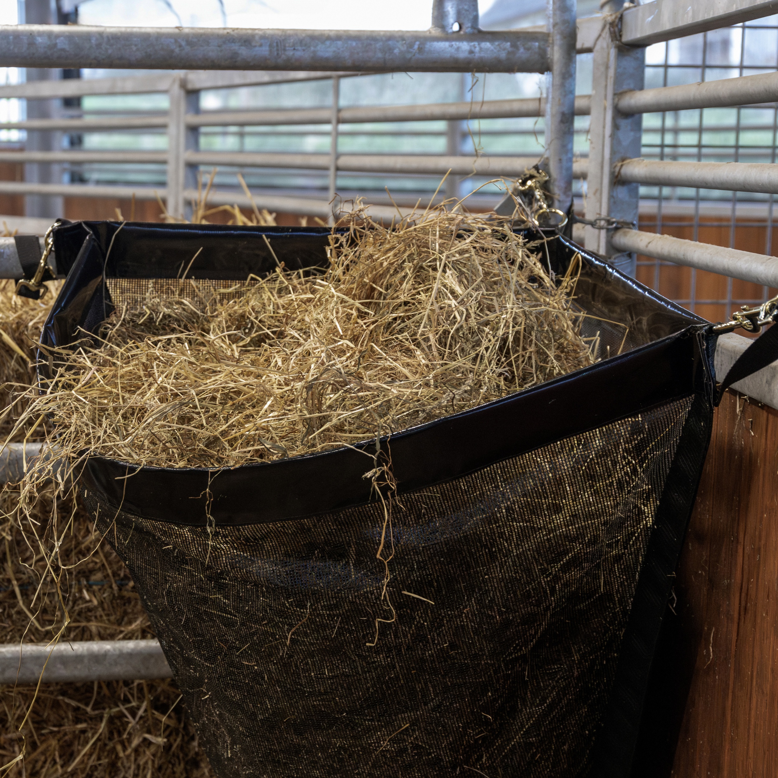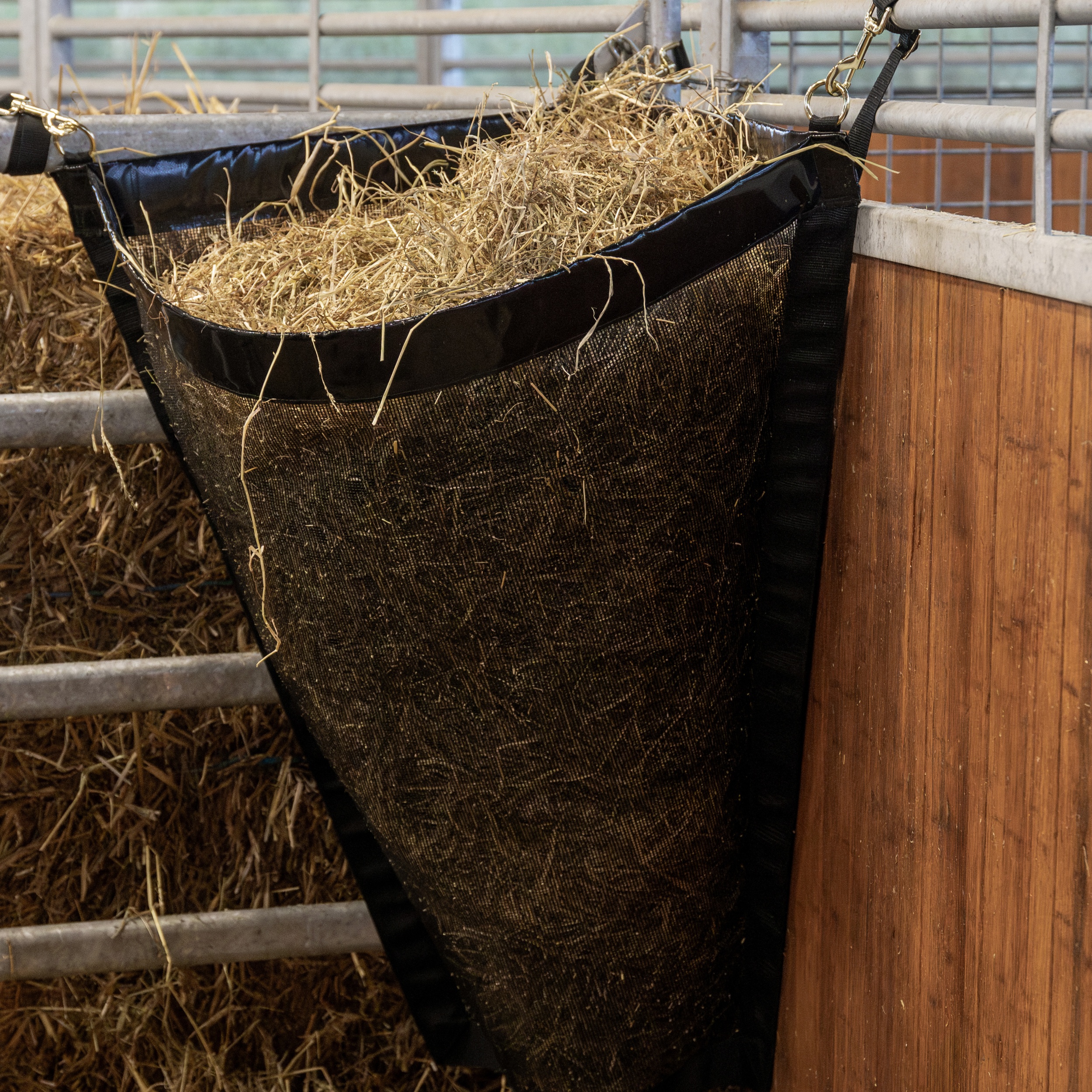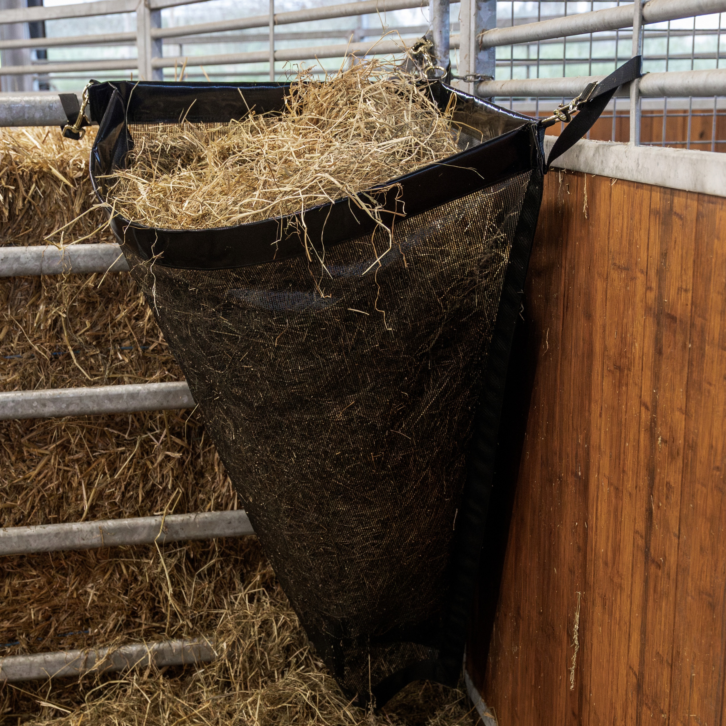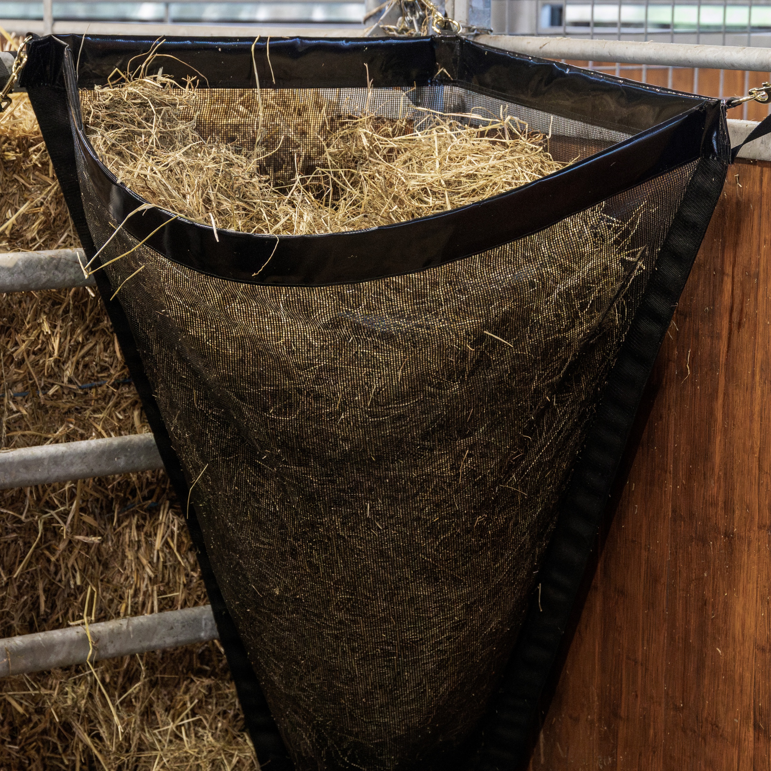 Deze hooizaak is speciaal ontworpen om netjes in de hoek van uw stal te passen. Dankzij de 3 haken hangt u hem eenvoudig op. Verkrijgbaar in maat M (tot 8 kg hooi) en maat L (tot 14 kg hooi). Maat M is 110 cm op het grootst, maat L is 140 cm op het grootst.