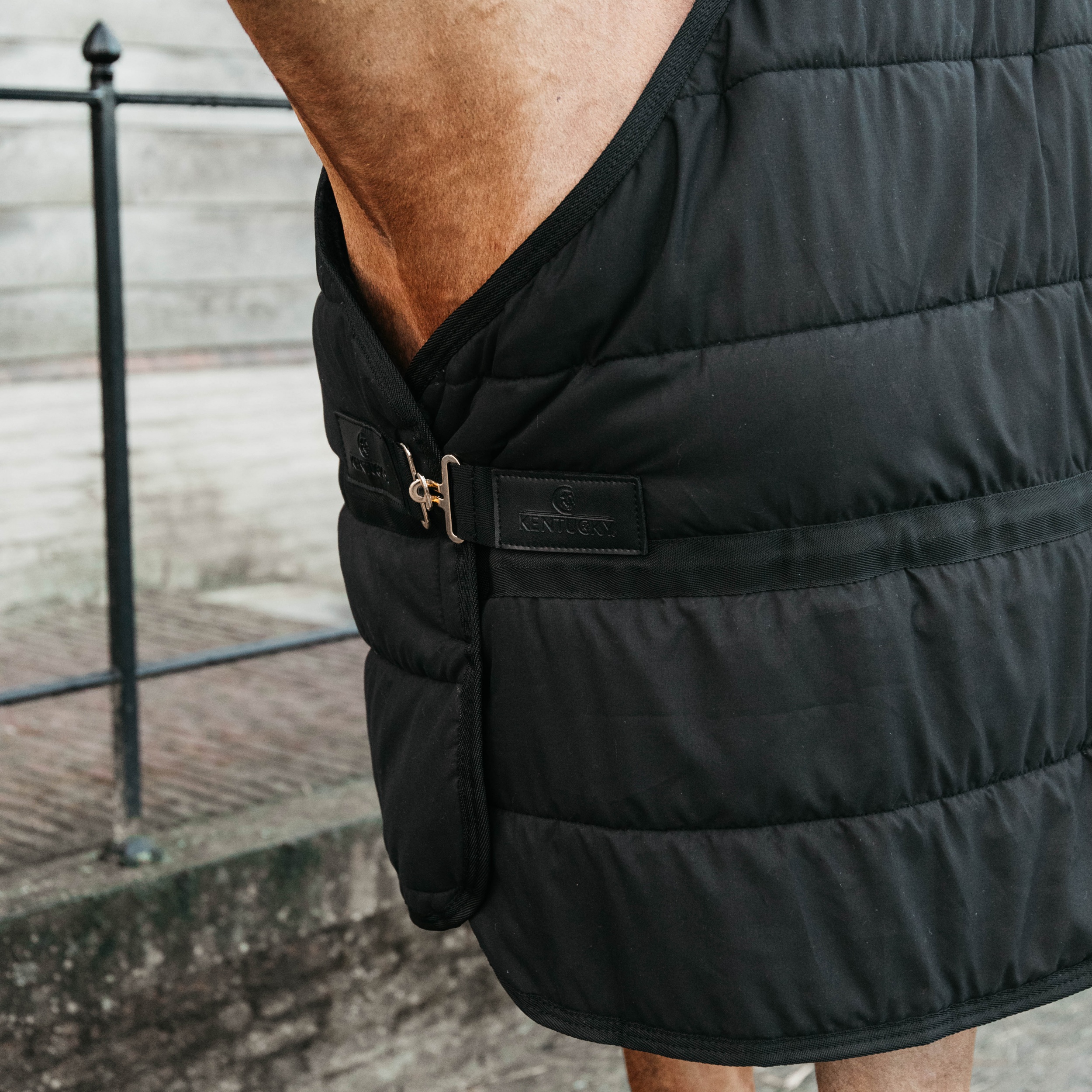 De buitenkant van het onderdeken is gemaakt van een polyester microvezel. Het garen in deze stof is opgeschuurd om een katoenachtig gevoel te geven. De voering van dit deken is gemaakt van onze populaire artificiële konijnenvacht. De artificiële konijnenvacht is enorm comfortabel voor je paard, vooral als hij net geschoren is of een gevoelige huid heeft. De voering creëert bovendien een extra isolerende laag die zorgt voor een glanzend effect van de paardenvacht. Voor de vulling gebruikten we 150g fiber fil vulling. Dit heeft dezelfde voordelen als dons maar, neemt in tegenstelling tot dons, geen geuren op.