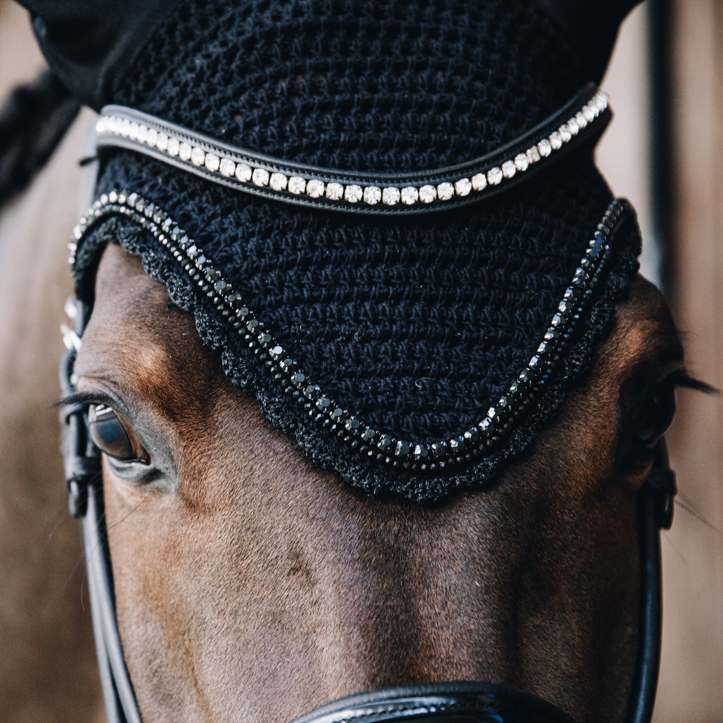 Het oornetje Long Stone & Pearl Soundless beschermt de oren van het paard tegen vliegen en geluid tijdens het rijden.