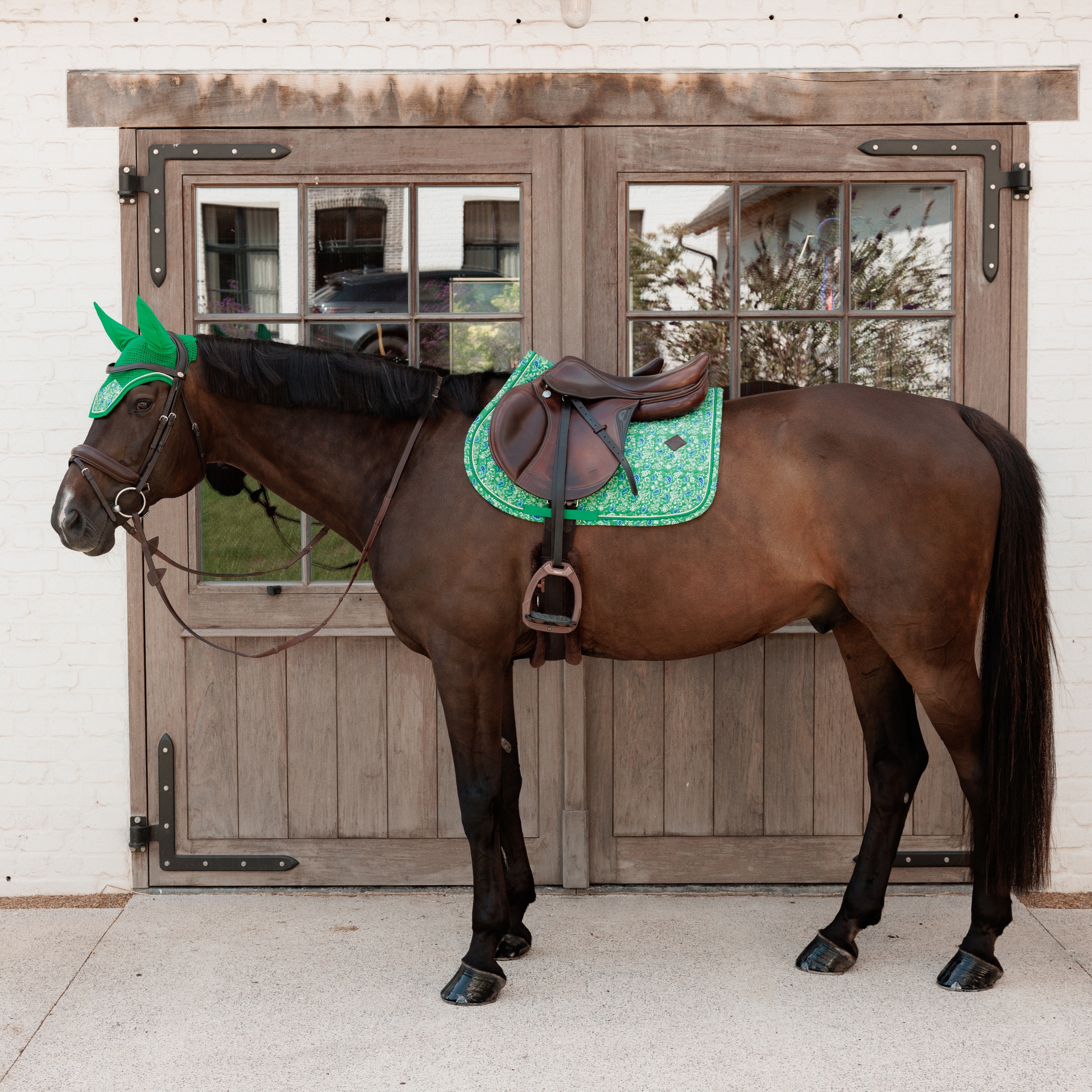 Dit oornetje valt op door zijn luxueuze Velvet details en exclusieve prints, waardoor het meer is dan alleen functioneel – het is een echte eyecatcher. Het verlengde nekdeel zorgt ervoor dat het goed op zijn plaats blijft, terwijl de rekbare stof rond de oren optimaal draagcomfort biedt. Subtiel en elegant, het past perfect bij het Velvet zadeldoek ref. 42807 voor een gecoördineerde en stijlvolle uitstraling.