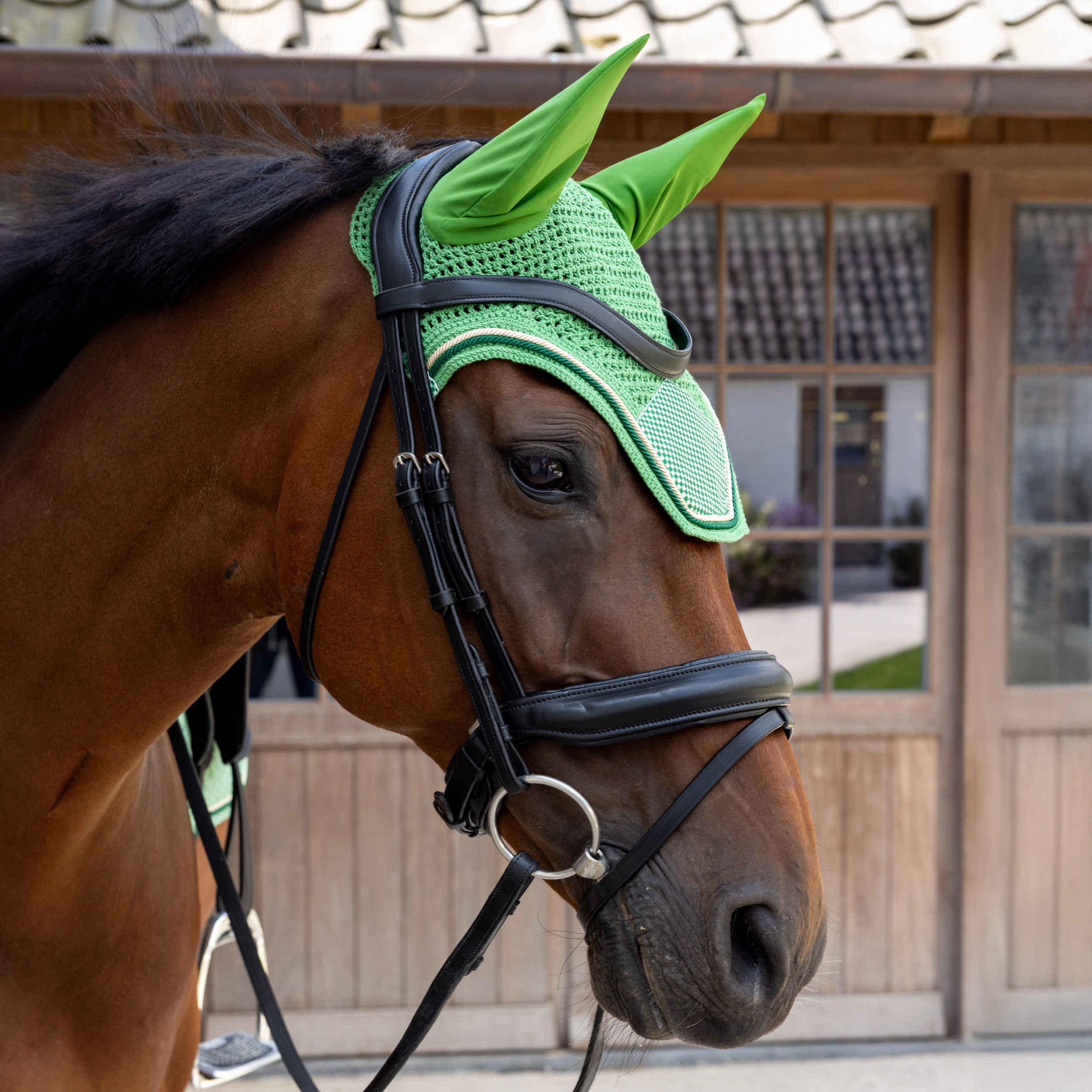 Dit oornetje valt op door zijn luxueuze Velvet details en exclusieve prints, waardoor het meer is dan alleen functioneel – het is een echte eyecatcher. Het verlengde nekdeel zorgt ervoor dat het goed op zijn plaats blijft, terwijl de rekbare stof rond de oren optimaal draagcomfort biedt. Subtiel en elegant, het past perfect bij het Velvet zadeldoek ref. 42807 voor een gecoördineerde en stijlvolle uitstraling.