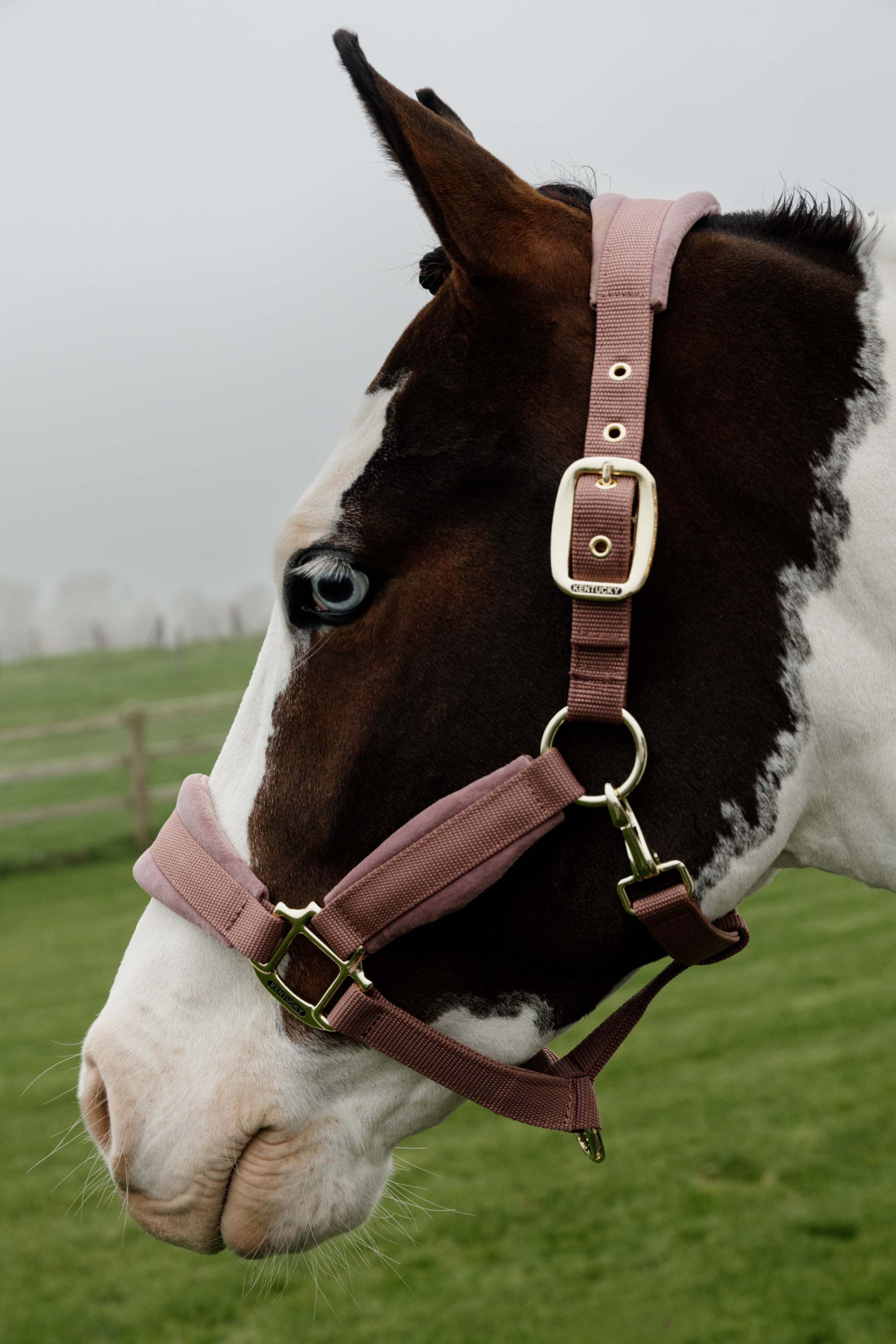 Het halster is gemaakt uit een sterke nylon stof, om de veiligheid van ja paard te garanderen. De neus, kaak en het nekstuk zijn verstevigd met velvet. Dit voelt enorm zacht aan en is erg comfortabel om te dragen. Het halster sluit met een vergulde karabijnhaak en is aan beide kanten van het kopstuk verstelbaar voor een perfecte pasvorm.
