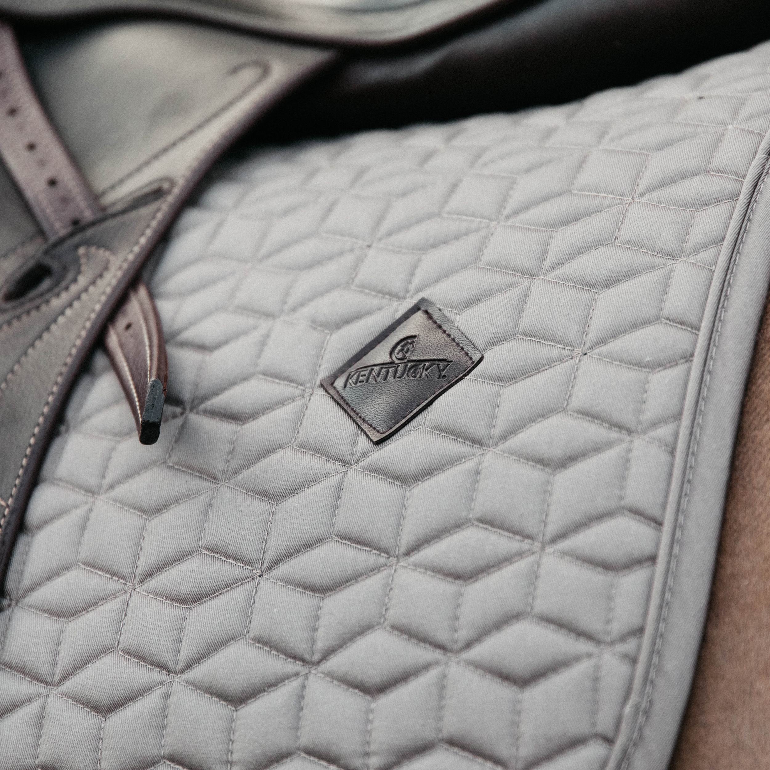 De buitenkant van de zadeldoek is gemaakt van een katoenachtig polyester in kubus quilting. Aan de linkerkant van de zadeldoek is een kleine vegan lederen patch met het Kentucky logo, onder het logo is genoeg plek gelaten om iets te borduren. De voering van het dekje is een vocht afvoerende katoen-polyester mix.