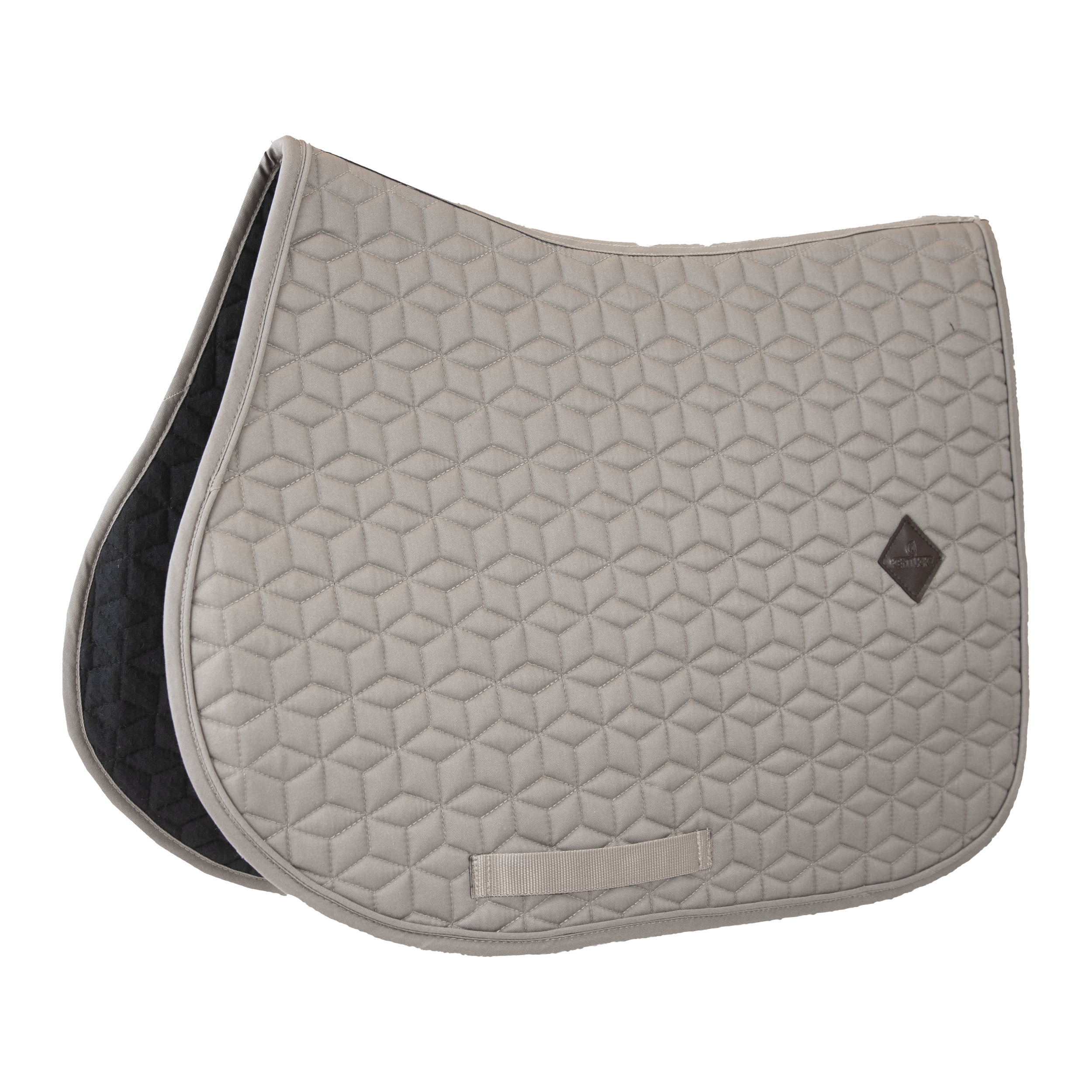 De buitenkant van de zadeldoek is gemaakt van een katoenachtig polyester in kubus quilting. Aan de linkerkant van de zadeldoek is een kleine vegan lederen patch met het Kentucky logo, onder het logo is genoeg plek gelaten om iets te borduren. De voering van het dekje is een vocht afvoerende katoen-polyester mix.