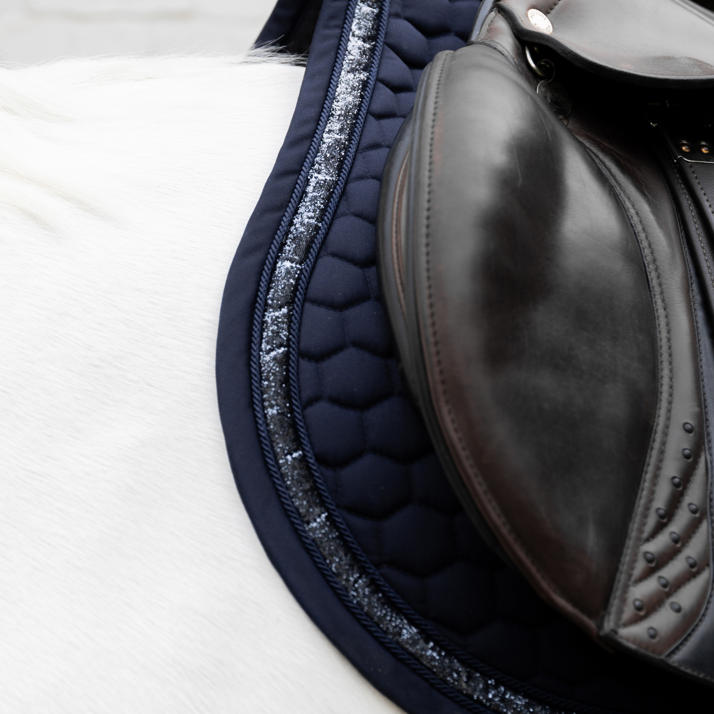 Met zijn glitterband voegt het Glitter Band Zadeldoek een vleugje elegantie toe aan je paard. Het exclusieve ontwerp trekt de aandacht, zowel tijdens de training als in de wedstrijdring. Bovendien biedt het ruime plek voor borduurwerk, zodat je een persoonlijke touch kunt toevoegen.