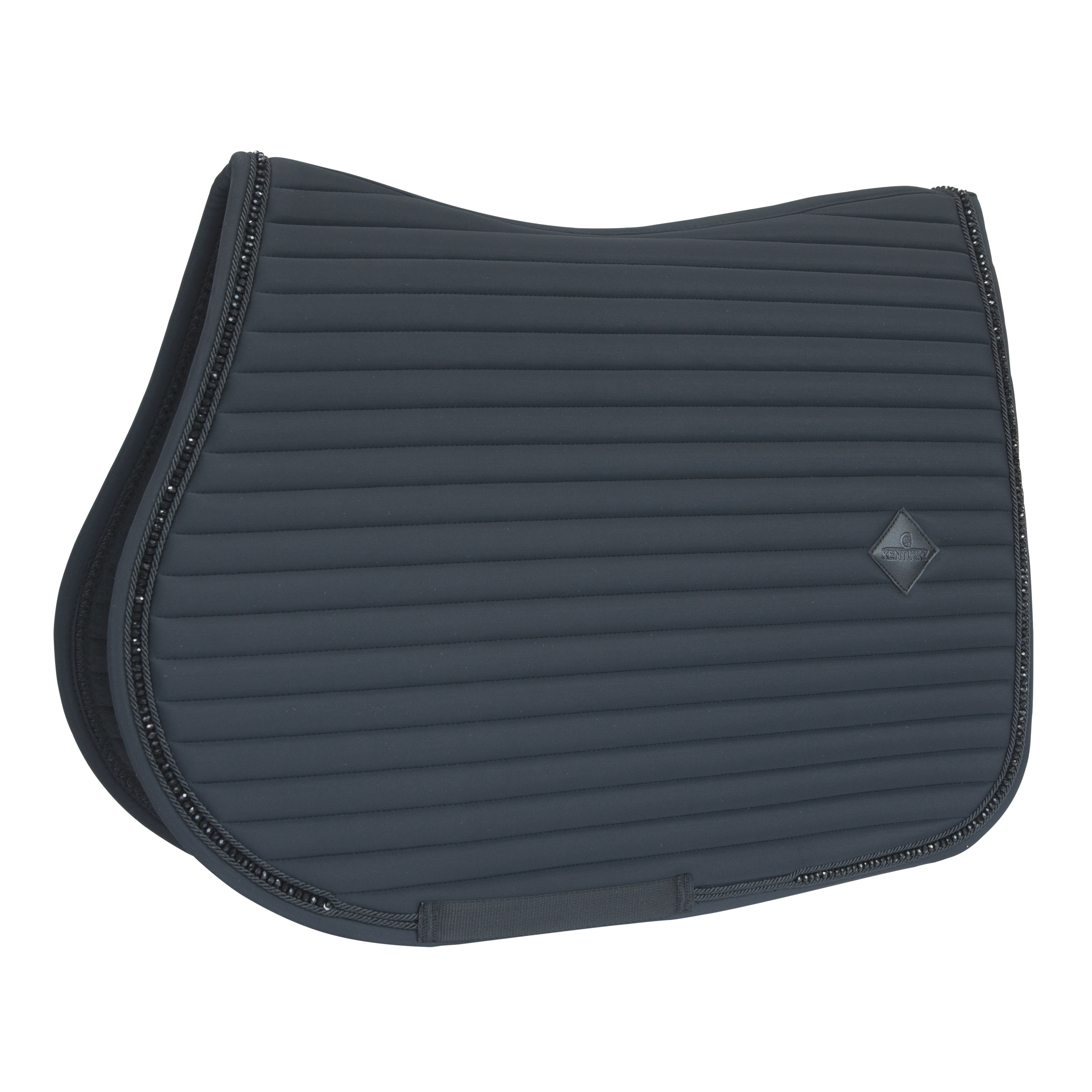 De zadeldoek heeft een horizontale quilting en is gemaakt van ademend materiaal (43% Nylon, 43% Polyester and 14% Spandex). Het Kentucky logo is subtiel aangebracht in de vorm van een lederen ruitje dat nog voldoende ruimte biedt om een eigen logo te borduren.