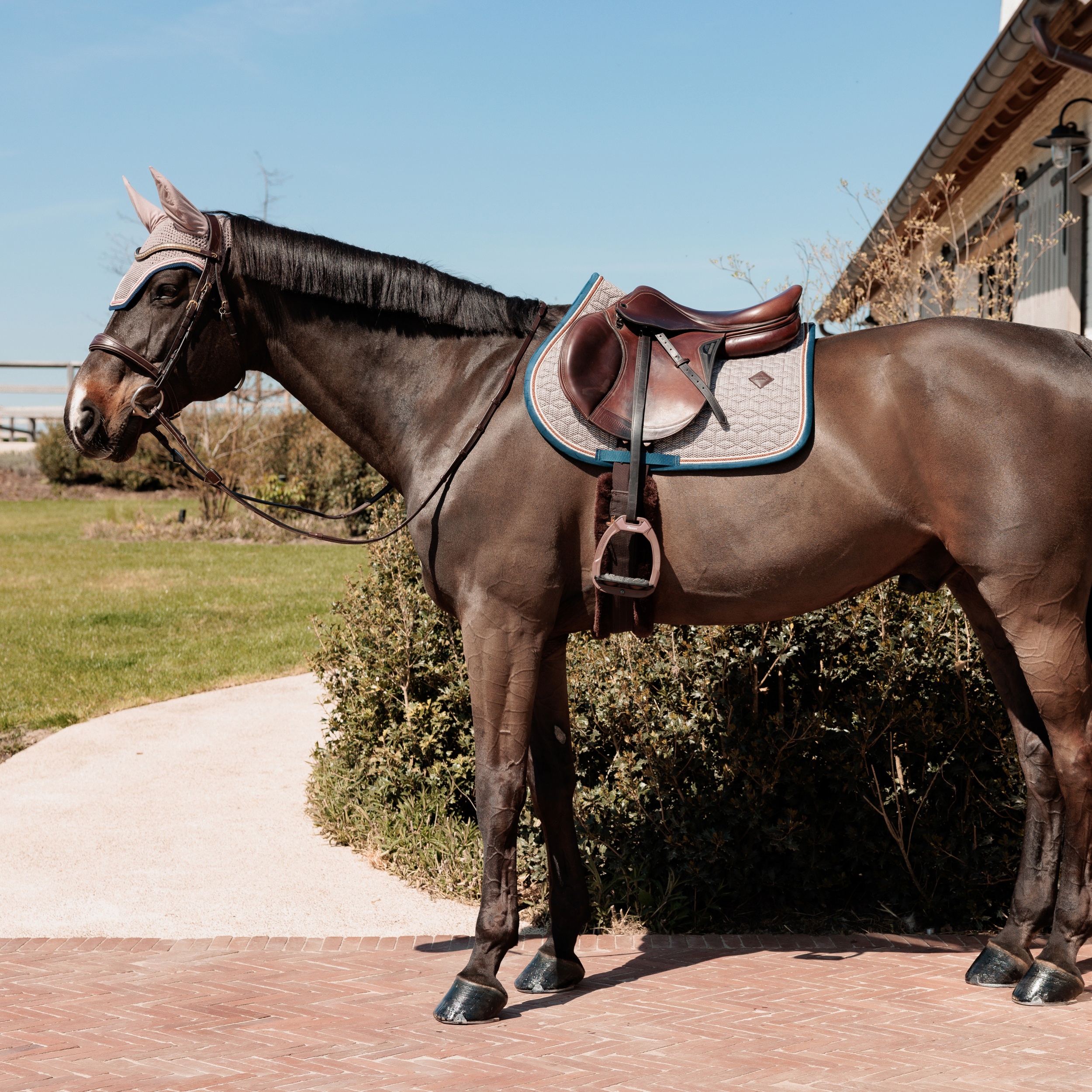 De zadeldoek Pied-de-Poule is meer dan alleen een praktisch accessoire – het is een echt stijlstatement. Het tijdloze Pied-de-Poule patroon, gecombineerd met hoogwaardige afwerking, maakt deze zadeldoek een opvallend item in elke collectie. Voor de ultieme match combineer je het met ons oornetje Wellington Pied-de-Poule – want ware elegantie zit in de details! Verkrijgbaar in spring- en dressuurmodel.