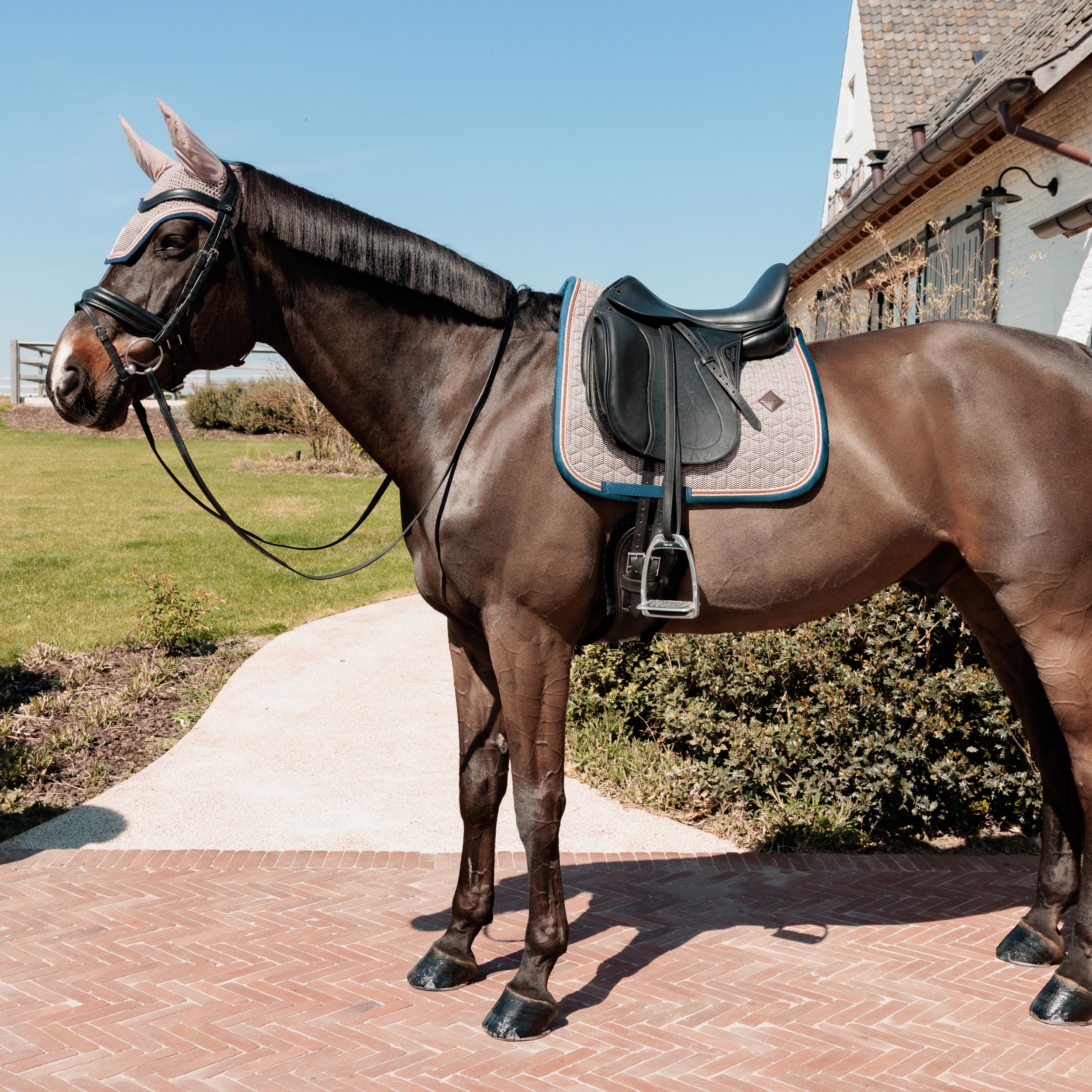De zadeldoek Pied-de-Poule is meer dan alleen een praktisch accessoire – het is een echt stijlstatement. Het tijdloze Pied-de-Poule patroon, gecombineerd met hoogwaardige afwerking, maakt deze zadeldoek een opvallend item in elke collectie. Voor de ultieme match combineer je het met ons oornetje Wellington Pied-de-Poule – want ware elegantie zit in de details! Verkrijgbaar in spring- en dressuurmodel.