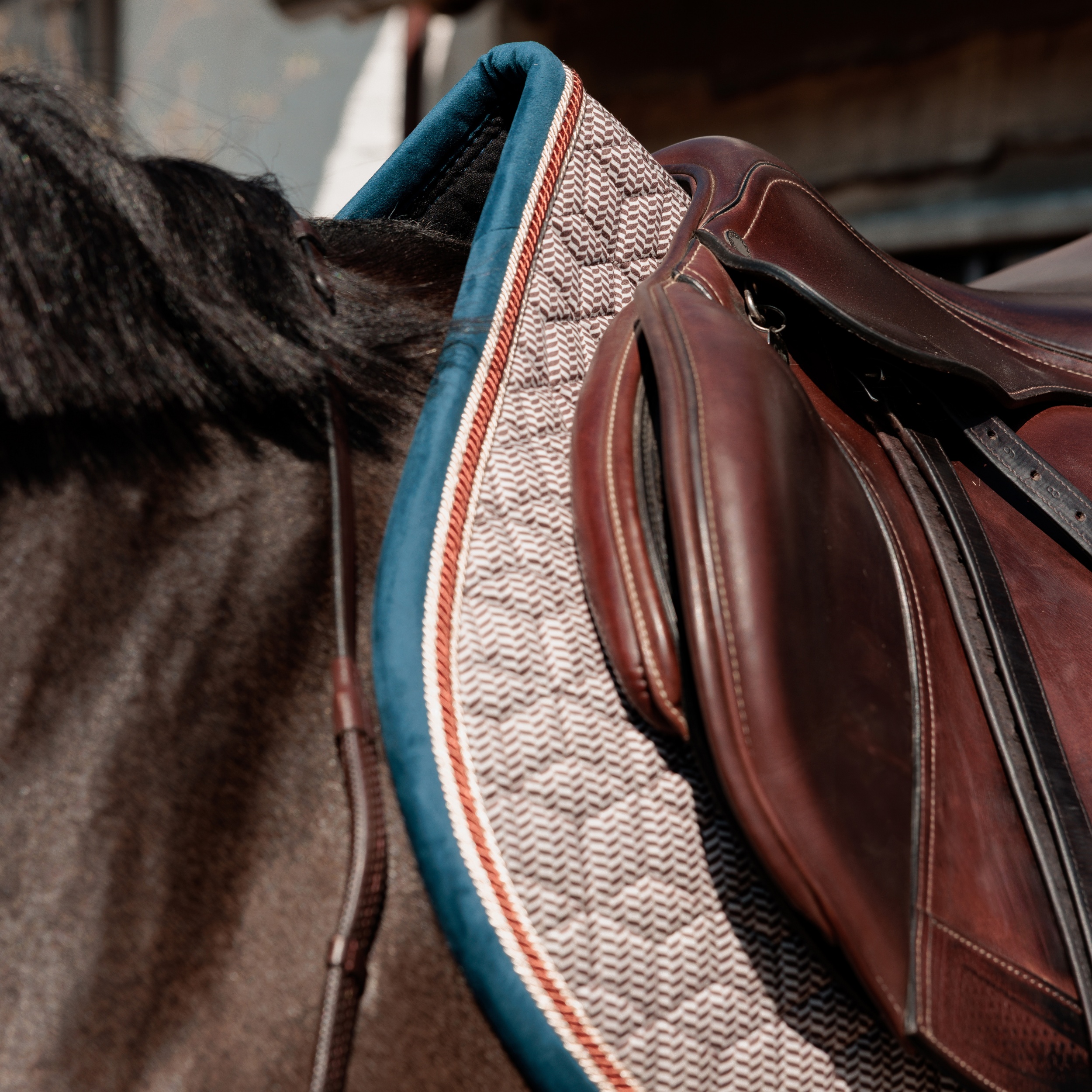 De zadeldoek Pied-de-Poule geeft een verfijnde en klassieke uitstraling aan de uitrusting van je paard en zorgt tegelijkertijd voor optimale prestaties. Ontworpen met zowel stijl als functionaliteit in gedachten, biedt deze zadeldoek uitstekende schokdemping en ademend vermogen, waardoor het de perfecte keuze is voor zowel training als wedstrijden.