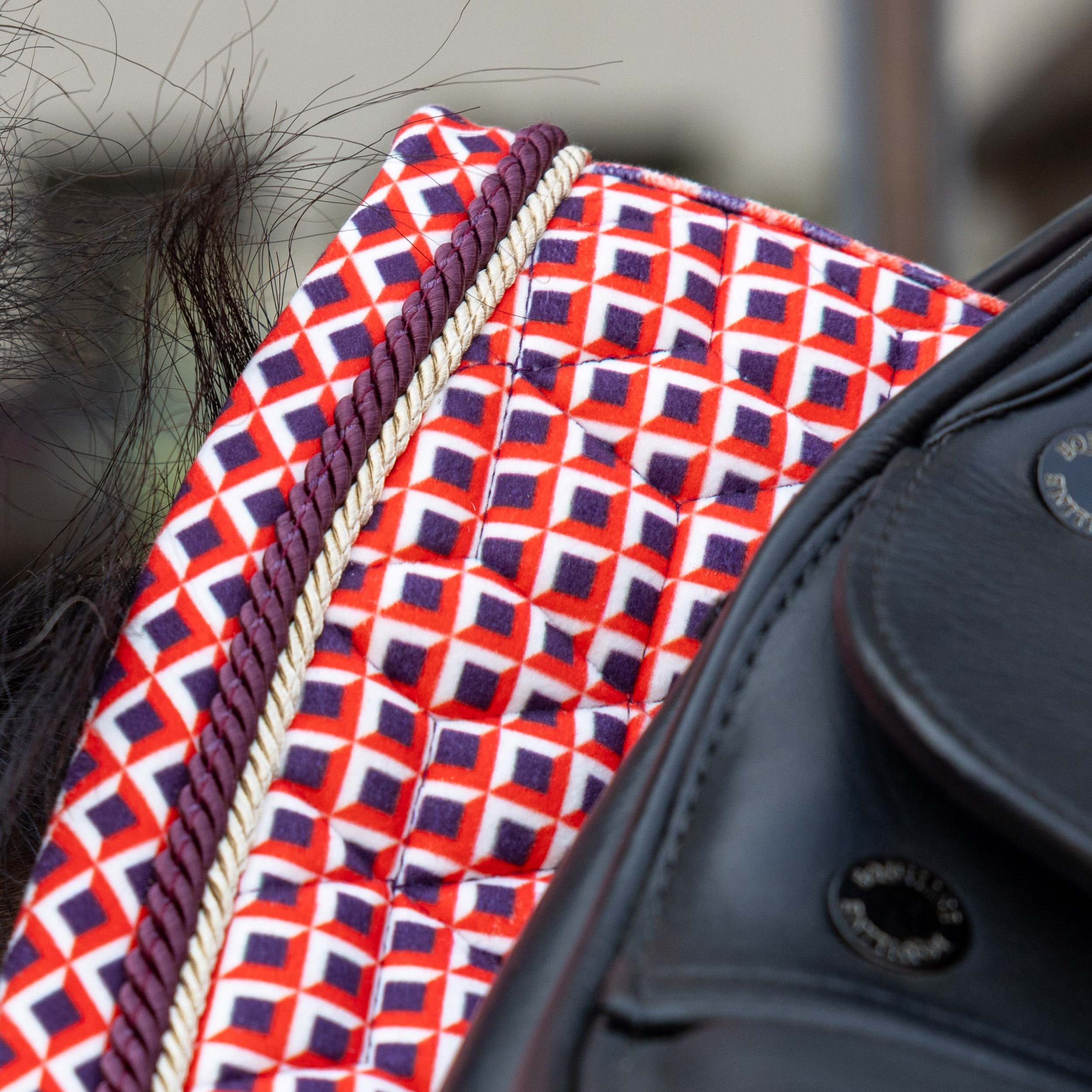 Dit limited edition zadeldoek valt op door zijn originele prints op de fluwelen stof, waardoor hij uniek is in de collectie. Het sterstiksel en de elegante koorden benadrukken het hoogwaardige vakmanschap, terwijl de functionele, sneldrogende voering zorgt voor optimaal comfort van je paard tijdens elke training. Kies tussen de dressuur- of springvorm die bij jouw discipline past, en maak de look compleet met het bijpassende oornetje ref. 42637 voor een verfijnde, harmonieuze uitstraling.