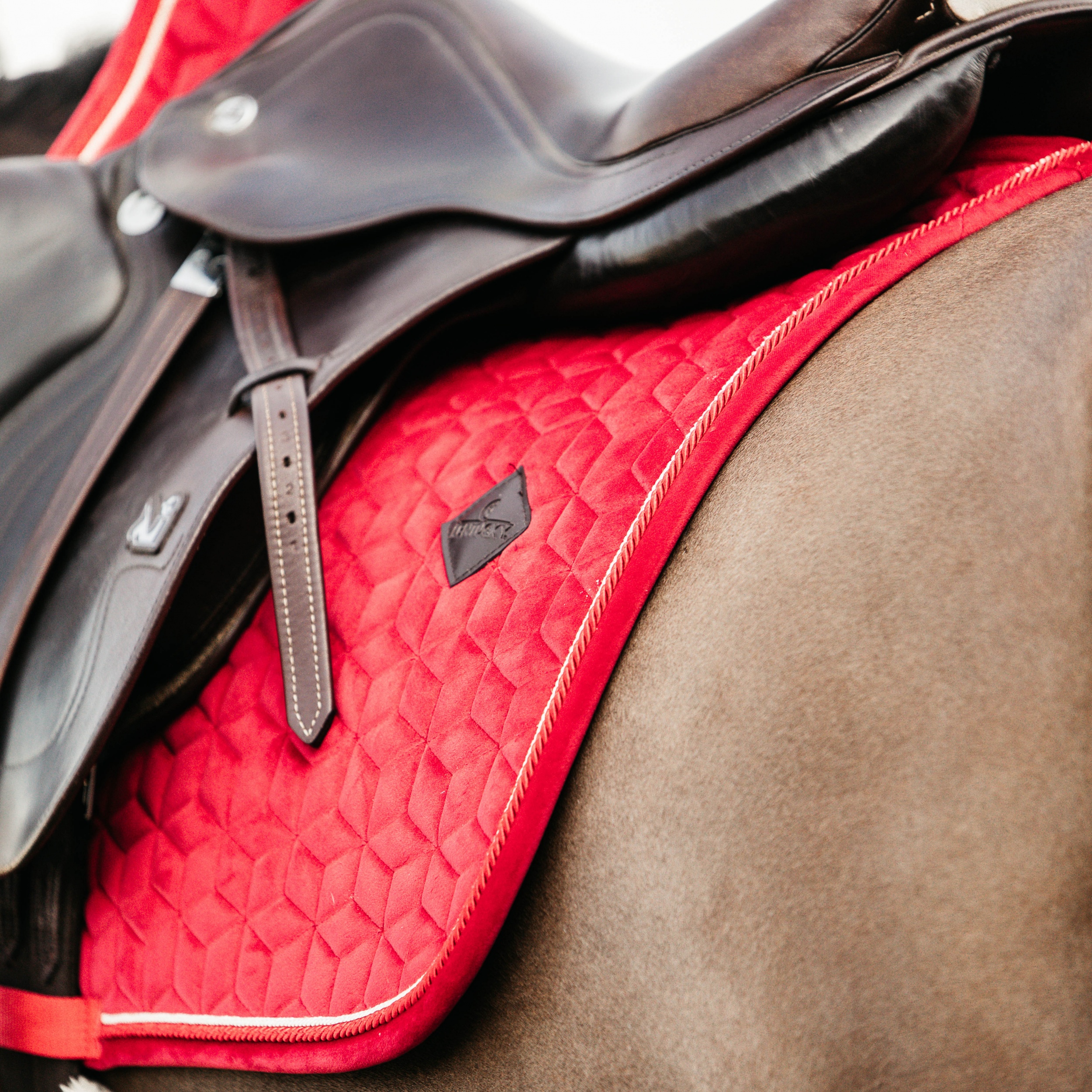 Dit zadeldoek Velvet Jumping met dubbel gedraaide bies is zeer stijlvol en elegant. Het zadeldoek biedt een schokdempende functie aan tussen de rug van het paard en het zadel en voorkomt eventuele wrijving.